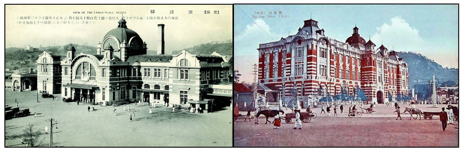 사진(左) 서울(경성)역 건립당시 모습의 엽서 사진          사진(右) 경성 우체국 당시 모습을 담은 사진 엽서