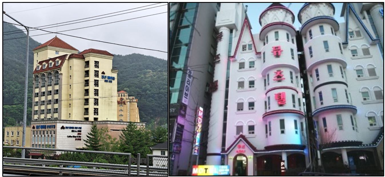 [사진] 한국 중소 도시에 가면 흔하게 볼 수 있는 유럽식 성모양의 모텔 숙박건물들 .