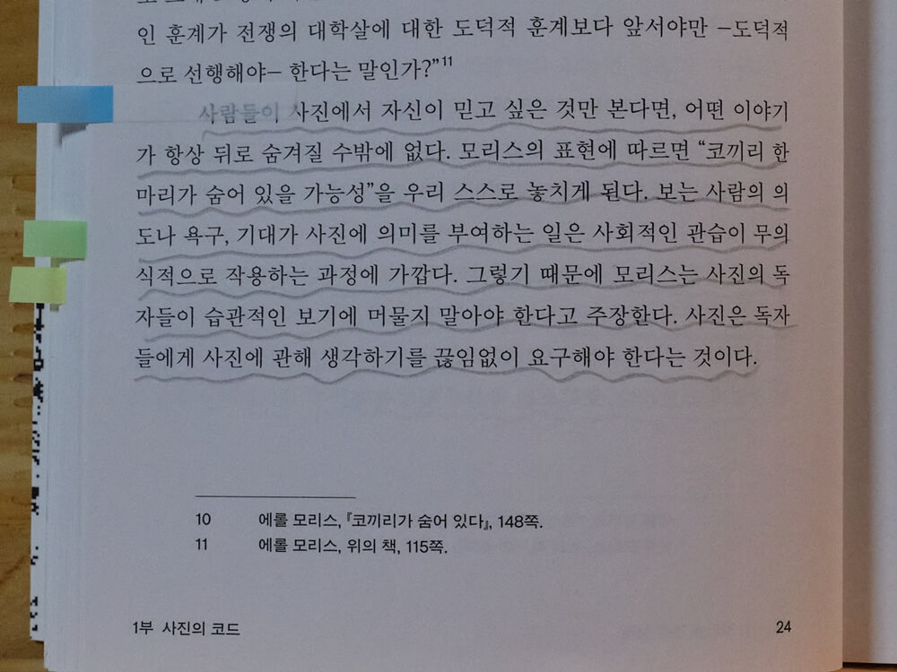 책은 네 파트로 구성되어 있습니다. 1부 “사진의 코드"는 19세기 전쟁 사진을 둘러싼 논쟁으로 시작합니다. 수전 손택이 조작된 사진이라 단정했던 로저 펜텐의 사진이 ‘정말 조작일까?’라는 의문을 제기한 에롤 모리스의 글은 권위에 기대 있던 저의 사진 읽기를 돌아보게 했습니다. 그리고 한국에서 있었던 마이클 케나의 솔섬 사진 표절 소송과 내셔널 지오그래픽의 반성 1) 등 익숙하게 알고 있던 사진을 다르게 보면 무엇을 만날 수 있는지를 보여 줍니다. 우리가 어떤 작품을 보며 좋은 사진이라고 느끼는 건 어쩌면 “전형적이고 상징적"이기 때문일 수도 있습니다. 그러니 무의식중에 자리 잡았을지 모를 선입견을 지우는 일은 보지 못했던 것을 보기 위한 첫걸음이 될 수 있습니다.
