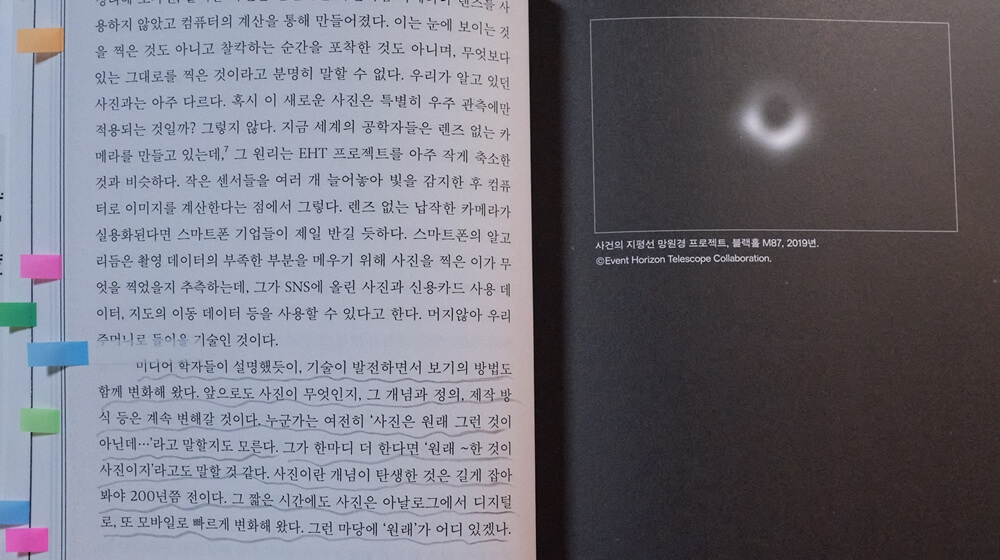 2부 “사진이라는 매체”는 광학적인 ‘물질성’을 띈 사진의 의미에 대한 질문으로 문을 엽니다. 이번에 책을 읽으면서 처음 알았는데, 전파 망원경이 찍은 블랙홀 ‘사진’은 흔히 이해하는 광학적 과정으로 만들어진 것이 아니라고 합니다. 블랙홀 사진은 망원경이 포착한 전파 신호 ‘데이터’를 영상화한 이미지입니다. 그럼 이건 과연 ‘사진’이라고 할 수 있을까요? 이처럼 사진의 정의에 의문을 제기한 2부는 벤야민과 수전 손택, 빌렘 플루서의 사진 철학으로 생각을 이어 나갑니다. 저자는 사진 보기와 읽기를 둘러싼 이들의 철학적 사유를 들여다보며 사진 고유의 속성은 무엇인지를 고민합니다. 이를 깨닫는다면 오직 사진으로만 가능한 일이 무엇인지도 알 수 있기 때문입니다.