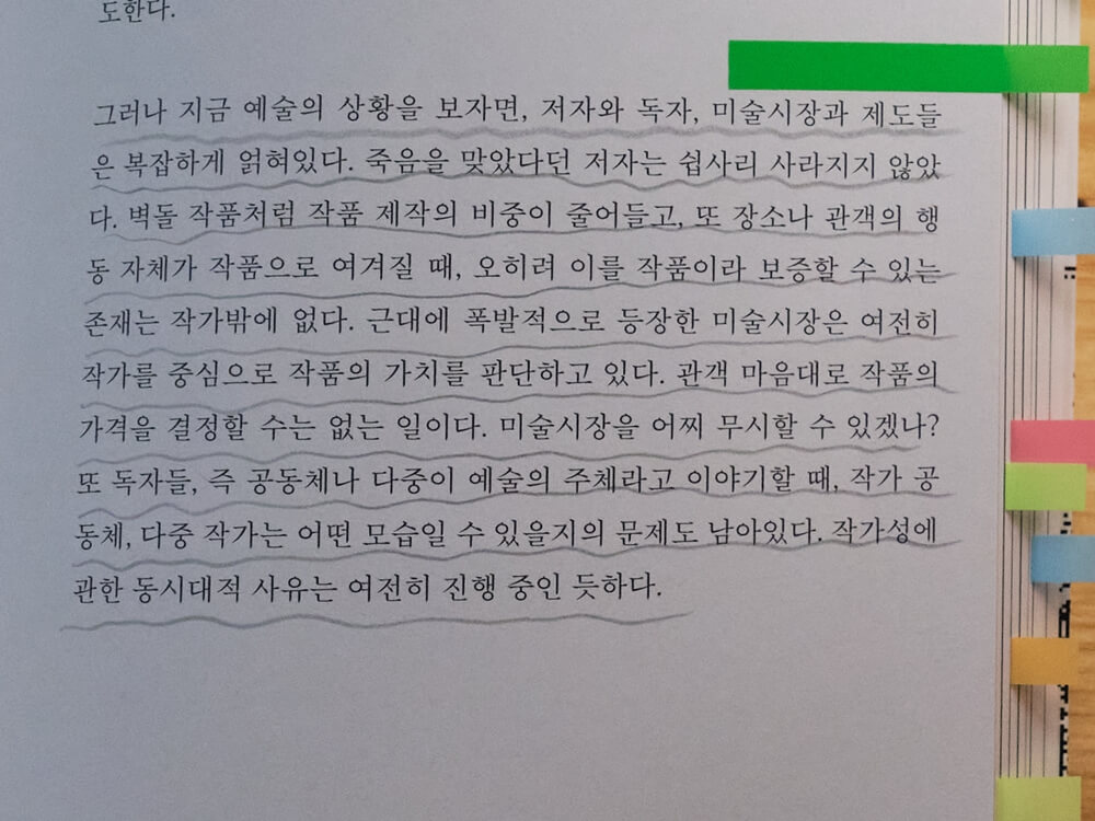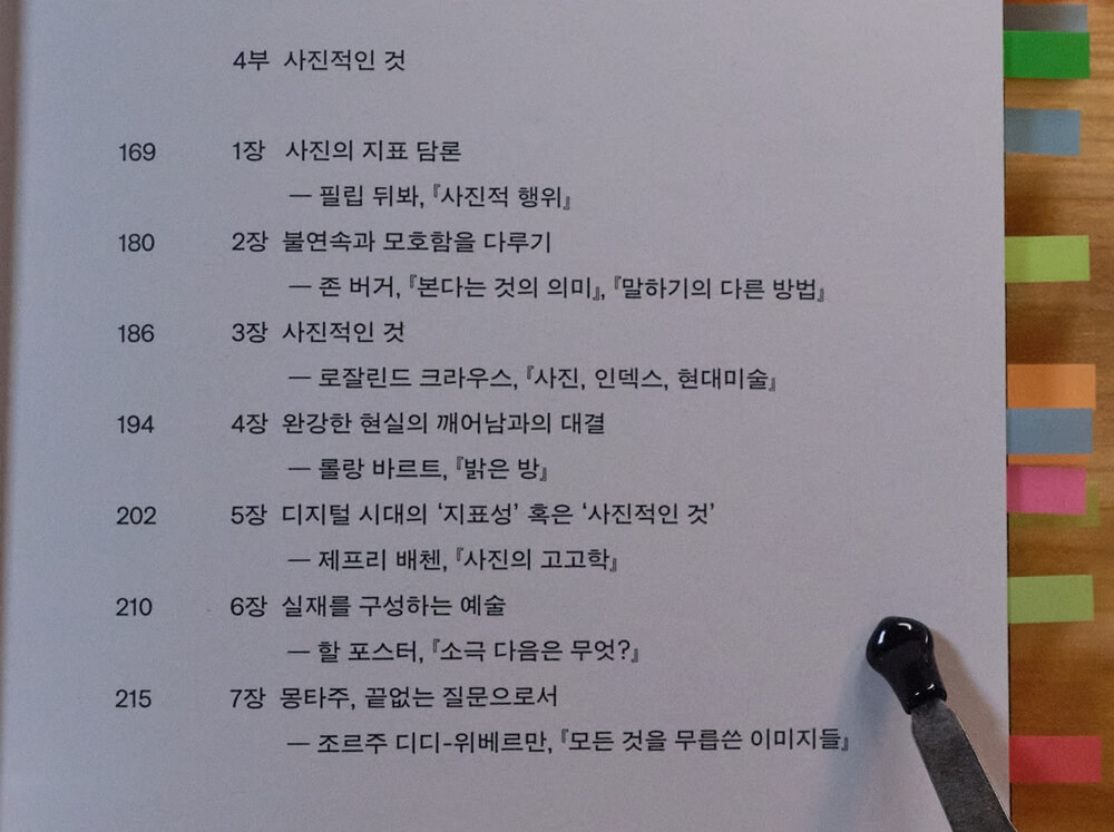 그래도 3부까지는 작가가 그린 약도를 따라 길을 찾을 만했다면, 4부 “사진적인 것"은 도전 정신을 불러일으키는 파트입니다. 저자는 필립 뒤봐와 롤랑 바르트, 로잘린드 크라우스와 조르주 디디-위베르만의 글, <사진적 행위>부터 <모든 것을 무릅쓴 이미지들>까지를 읽고 해석하며 “성좌들을 구축"하려고 시도합니다. 다만 독자가 이 시도를 한 번에 따라가기는 무리일 듯합니다. 저자가 인용한 원글을 읽고, 다시 그가 그린 약도를 여러 번 따라가 보아야 성좌의 흔적이나마 그릴 수 있지 않을까요.