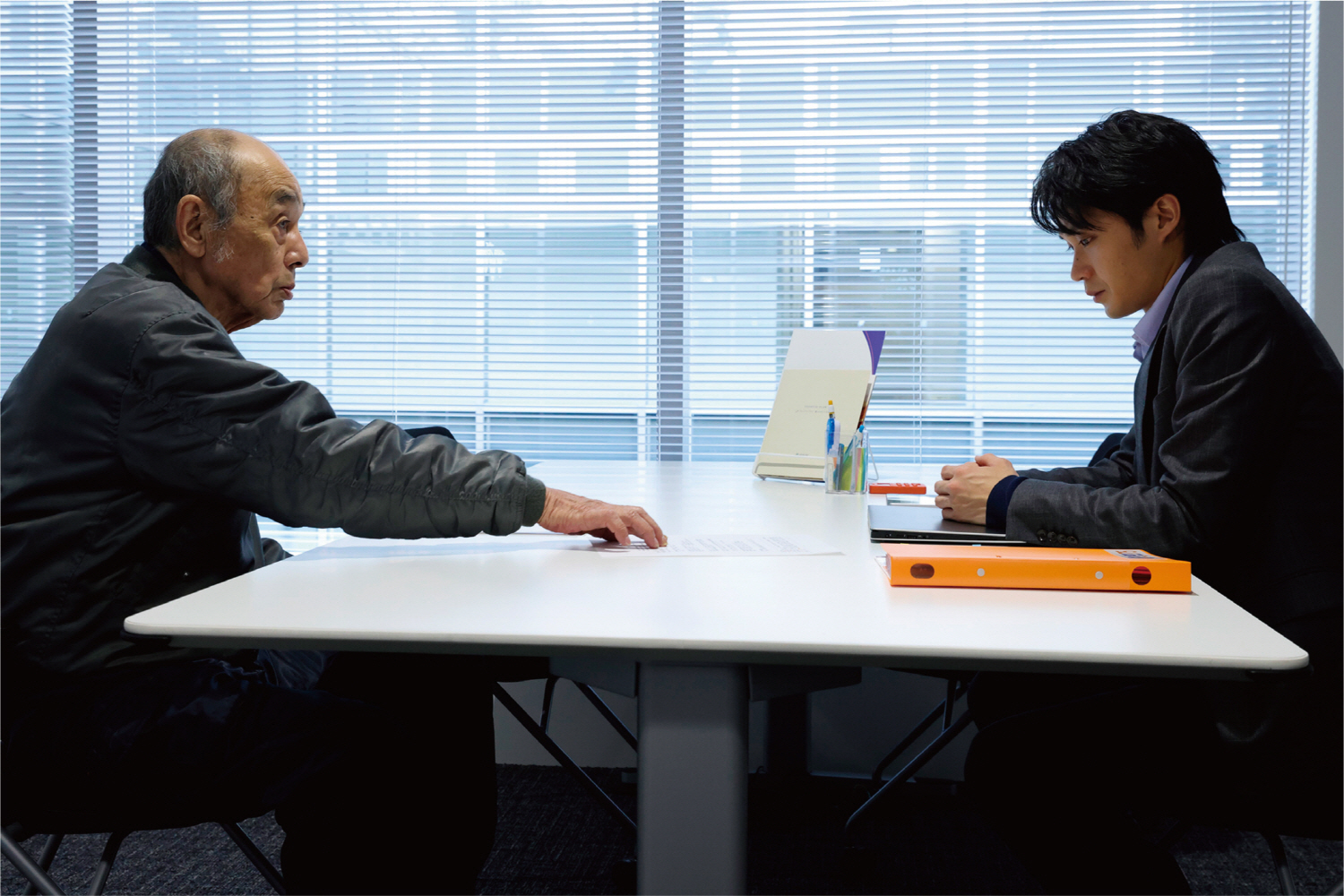 편협한 합리주의에 무관심하다면 펼쳐질 무참한 미래를 경계하는 <플랜 75>는 고삐를 늦추지 않고, 경제적 능력이 부족하다면 곧바로 사회에 고립되는 미치를 포함한 75세 이상 노인들의 일상을 최대한 담아내고자 파고든다. 78세인 미치는 호텔 룸메이드로 성실히 일하며 생계를 유지하고 있었으나, 동료가 호텔 화장실 청소 중에 쓰러지자 평판 훼손을 우려한 호텔 측의 노령 노동자 대상 정리 해고 때문에 일을 그만둔다. 그 일이 있었던 직후 미치는 이곳저곳을 돌아다니면서 아르바이트를 알아보지만 번번이 실패할 뿐만 아니라, 동네 도서관처럼 보이는 공간에서 컴퓨터로 구직 활동을 해보지만 연령 필터가 적용되어 시스템적으로 채용을 거부당한다. 겨우 찾은 심야 교통 정리 보조 업무는 고령인 미치에게 상당히 버겁다. 설상가상으로 미치는 75세 이상 노인이라는 이유만으로 집을 계약하려면 2년 치 월세를 내야 하나, 도무지 그럴 수 없는 여건에 처한 미치는 거주 문제에도 봉착한다. 결국 버텨낼 수 있는 상황은 미치가 ‘플랜 75’ 상담 및 서비스를 신청하게 만든다. 특히 미치가 마지못해 삶을 포기하기로 ‘선택’을 하게 되는 과정이 눈에 보이지 않는 국가의 ‘알고리즘과 순서도’ 문제 같은 설계에 의해 진행되기에 심각하게 받아들일 수밖에 없다. 미치의 일상처럼 상세하게 묘사되지는 않지만 히로무의 시점 숏에 담긴 히로무의 외삼촌 또한 별반 다르지 않다. 히로무의 외삼촌은 성치 않은 몸으로 겨우 환경 미화 일을 처리하고 있으나, 폐허와 다름없는 거주 공간은 그의 삶이 얼마나 변변하지 못한지 직감하게 한다. 끝내 놀이터에서 ‘플랜 75’ 담당 시청 직원들이 무상으로 제공하는 음식을 씁쓸히 먹는 그의 모습은 히로무의 시선을 빌려 보는 이들마저 무기력감을 온몸으로 받도록 한다.