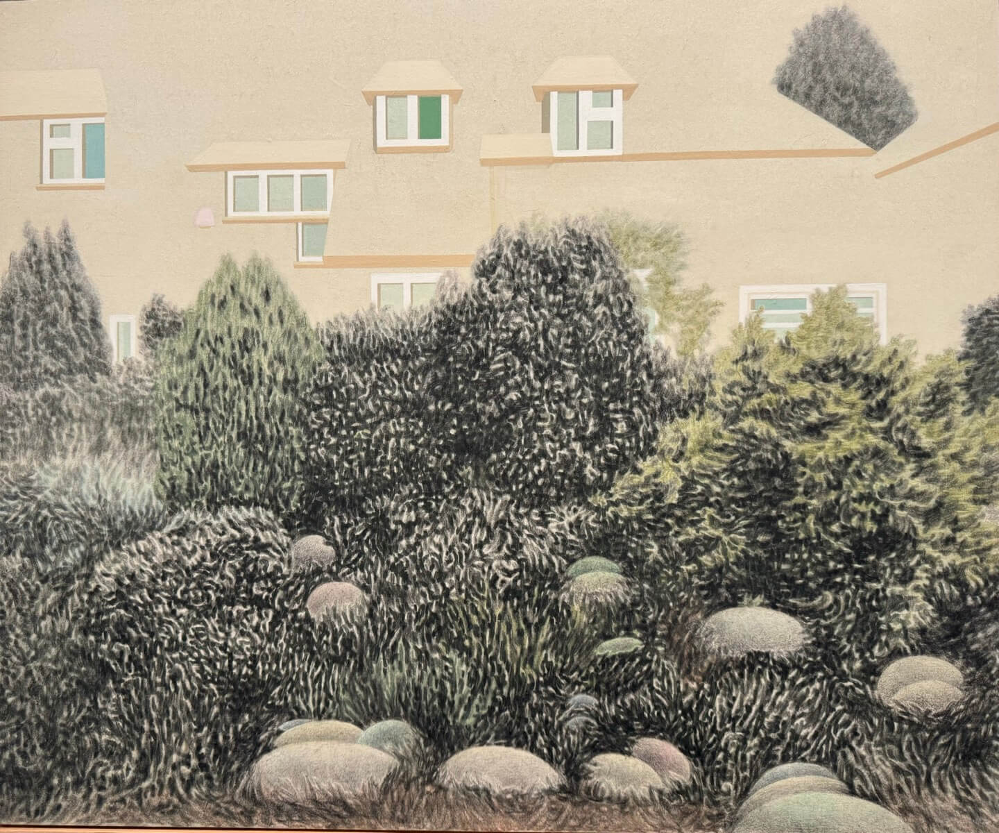시간이 흐른 뒤의 눈길은 어디에 머무르나. 제 이름을 부르는 식물들이 뒤로 물러서며 하나의 풍경을 이룬다. 세밀한 먹빛의 붓질 위로 아삼삼한 더께가 낀 듯, 미간을 찡그려야 바로 보이는 햇살 속의 풍경처럼 풀더미가 눈부시게 흐릿하다. 한낮의 햇볕에 익어 눈보다 코를 먼저 자극하는 풀더미. 버스럭거리는 바람 한 점 없이, 고막이 울리도록 먹먹한 한낮의 풍경이다. 전경前景의 수풀은 알을 품듯 돌을 껴안고, 후경後景의 건물은 빛에 맞서듯 어깨를 벌린 채 열린 창문으로 푸르름을 슬며시 내보인다. 하얗게 부신 건물 뒤로 빼곡히 얼굴을 내민 무성함이 이 풍경의 주인이 누구인지 말하고 있다. 이 모든 풍경 속에 가장 먼저 자리를 잡은 이 세계의 주인, 식물이다. 작가는 세상에 존재했던 순서대로 차곡차곡 화폭 위에 세계를 올린다. 먼저 식물이 자리를 잡으면, 인간의 것들이 기다렸다는 듯, 하나둘 뒤를 따른다. 손가락으로 곱게 으깬 분채는 아홉 번이고 열 번이고 붓 자국 없이 한 꺼풀씩 세계를 겹으로 감싼다. 마치 보호막처럼, 혹은 그 내밀한 속 고갱이의 비밀을 위한 가림막처럼, 주름 없이 세계를 감싼다. 인간의, 인간적인 것들을 아우르는 존재의 포용력에 자연이 고요히 스민다.