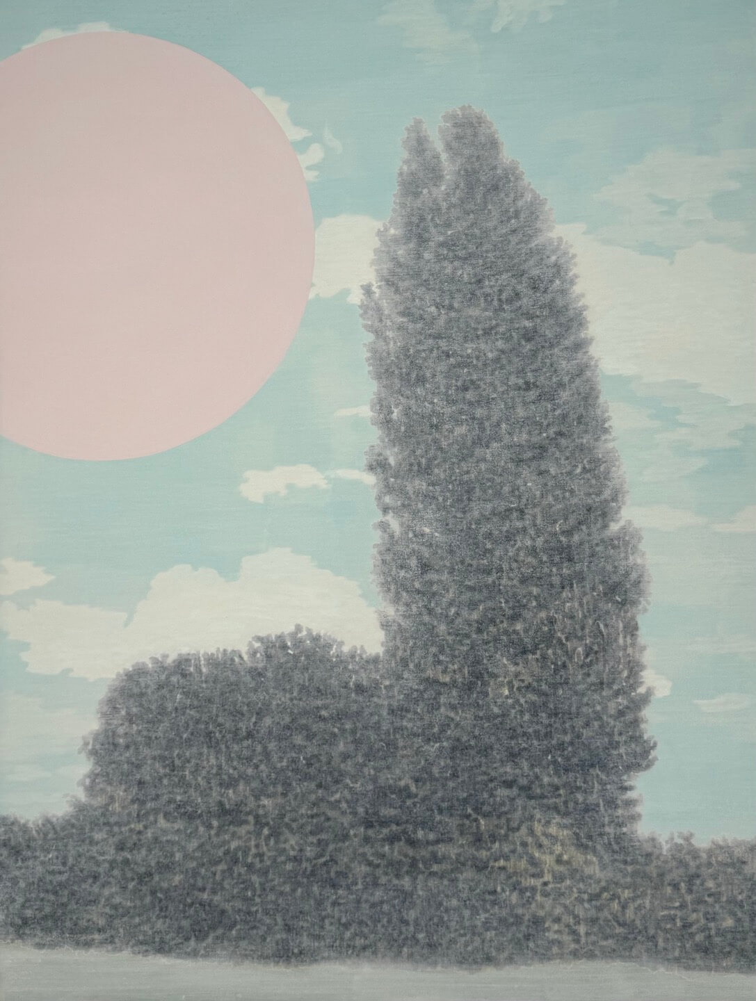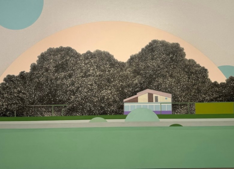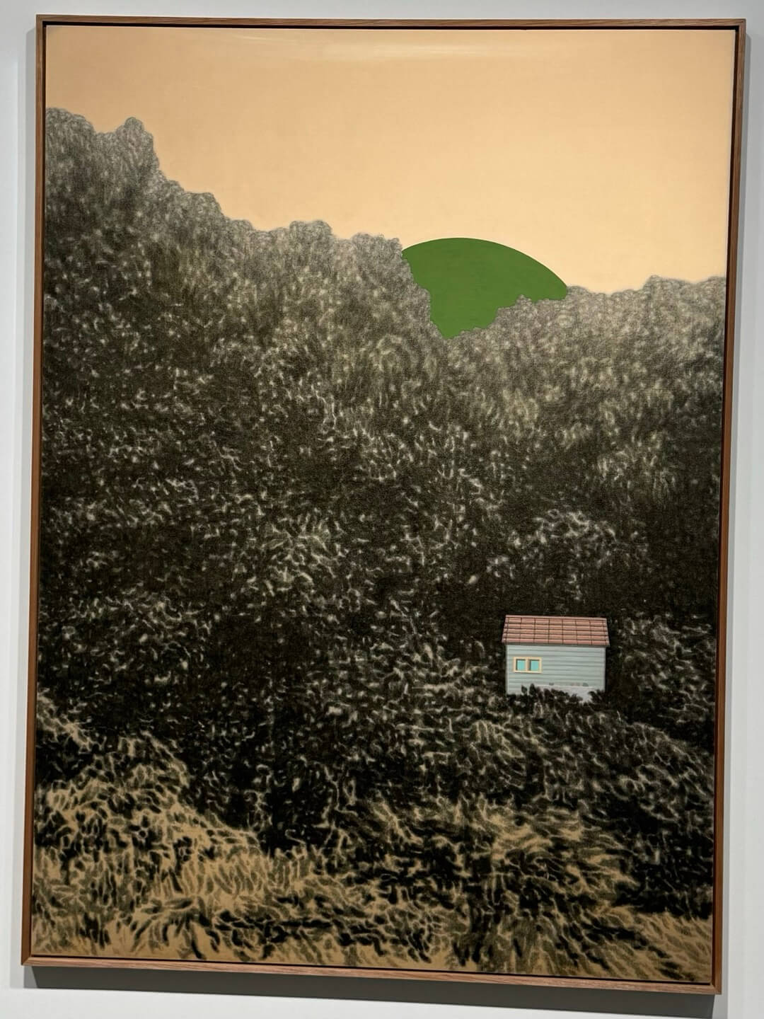왕성한 수풀에 몸을 기댄 작고 좁은 집을 보면 인간이 얼마나 보잘것없고 나약한 존재인지, 기댈 곳이 없다면 스스로 무너질 한 줌의 신기루 같다는 사실에 얼굴이 붉어진다. 자연 속에서 인간은 사춘기의 소년/소녀처럼 수줍고 광포狂暴하다. 수풀 사이로 몸을 숨긴 집은, 덜 자란 아이의 육체처럼 빈약하고, 천진하지만 사악한 호르몬을 닮아 결말을 알 수 없는 미완성으로 남는다. 저 집을 나서는 아이의 손에 어쩐지 누군가를 해칠 것만 같은 -그것이 자신일지도 모르는- 불안함이 들려있을 것 같다. 인간은, 별생각 없이, 자신을 해할 수 있는 유일한 동물이니까, 자연과 우리가 어떻게 연결되어 있는지, 무지無智하고 무용無用하게 들이댈 수 있는 유일한 생명체이니까. 수풀 너머 둥근 초록이 그런 불안감을 끌어당긴다. 선명한 초록으로 물기 없이 내려다보는 초록 원은 태양이라기보다 하늘에 뚫린 커다란 구멍 같다. 어디선가 이 세계를 바라보고 있는 다른 세계의 구멍. 어린 불안감을 잠재울 커다란 존재, 무한無限하고 무해無害한, 다른 세계로 건너감을 가능하게 만드는 통로는 아닐까.