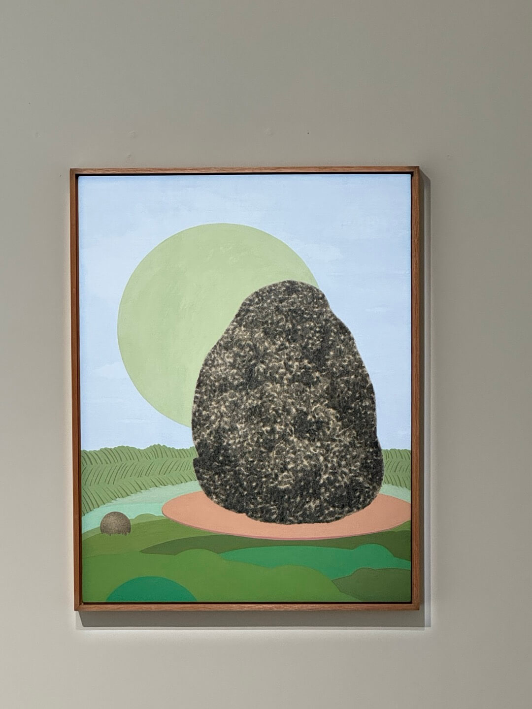 맨질맨질한 풍경과 대칭되는 질감의 거친 표면이 오랜 취미로 모인 오래된 자연, 수석壽石을 닮았다고 생각했다. 파스텔 색조의 차분하고 비현실적인 색감은 잘 마무리된 실내처럼 반듯하고 깔끔하다. 이질적인 감촉, 대비되는 색상, 가까이 들여다본다. 세계를 자르고 보이는 풍경의 이면인가. <가려진 것들_그리고 마중>의 초록 반원이 다른 세계를 향한 구멍이라면, <둥근 위로>의 폐곡선은 이 세계를 향한 구멍, 안팎이 바뀌는 시선의 반전을 보여준다. 그제야 눈에 들어오는 진경眞景, 그 속으로 여기의 풍경이 펼쳐진다. 작가는 구멍처럼 보이는 풍경의 외곽이 서로 기대고 있는 새의 실루엣이라고 말했다. 서로의 품을 파고들며 온기를 나누고, 서로를 위로하며 있는 두 마리의 새. 새들은 얇게 포개져 여린 온기를 서로에게 전한다. 자연이 되지 못한 우리에게 풍경이 내미는 손, 자연이 건네는 모나지 않은 손길, 둥근 위로慰勞다.