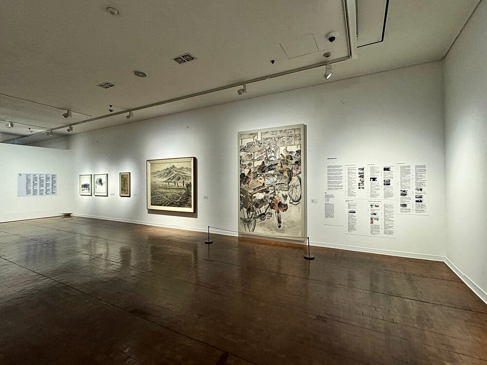 그렇다면 자료가 전시의 서사를 완성하고자 하는 동시에 이를 지연시키는 이유는 무엇일까? 자료의 시각화가 부족했기 때문일까? 미술관에서 동시에 진행 중인 수장품 주제 기획전 《끝없이 갈라지는 세계의 끝에서》(2024.08.22~2024.11.17)이 ‘SeMA 소장품의 동시대성’과 ‘소장품의 여성 작가 비율’을 표와 그래프를 통해 시각화한 것처럼 자료를 한눈에 들어오게 구성하지 못해서일까? 《격변의 시대》의 자료에서 보다 시각화가 이루어져야 하는 부분은 내용 자체가 아닌, 결코 분리될 수 없다고 말한 사회, 개인의 삶, 예술 사이의 연결고리다. 이 세 부분은 역사적 사건이 일어나고 종료된 시기, 작가가 학교를 입학하거나 작품이 입선한 연도, 국전 동양화부가 구상, 비구상 부문으로 분리되던 때처럼 연월일로 구분될 수 있는 경우가 많아 자료에 기입되었을 때, 이들의 시간이 현재까지 영향을 주고 있음을 드러내기보다는 과거에서 발생해, 과거에서 끝나는 듯한 느낌을 자아낸다. 1950년부터 1990년까지 경향신문, 동아일보, 조선일보 등에 실린 동양화와 한국화 관련 기사를 통해 동양화의 흐름을 정리한 자료는 4개의 시기별로 재구성하는 시도를 거쳤음에도 다루는 내용의 범위가 지나치게 넓어 내용을 파악하는데 어려움이 있다. 자료를 읽어내리는 것은 관람자의 몫이지만, 작품과 ‘자료’를 전시한다고 자신을 정의하는 전시는 이에 대한 접근을 수월하게 할 의무가 있다.