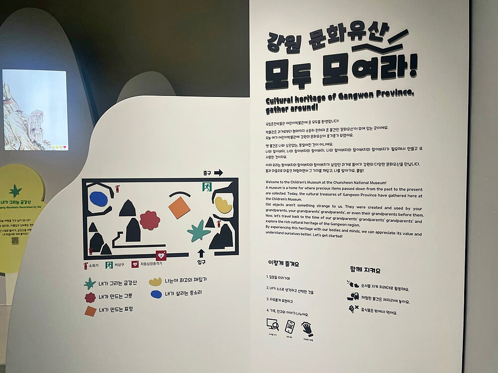 전시장에 들어서면 바로 우측에 전시의 포문을 여는 메인 패널이 설치되어 있다어린이의 시선과 눈높이에 맞춘 친절하고 상냥한 전시 소개를 따라 읽다 보면, ‘이렇게 즐겨요라는 부분을 발견할 수 있다. ‘강원 문화유산 모두 모여라!’에서 인상 깊었던 것이 바로 이런 지점이었다아이들의 발달 과정과 흥미 요소에 맞게 전시 콘텐츠를 구성하는 것은 물론이거니와 어떻게’ 어린이박물관을 즐겨야 하는지또 어떻게’ 즐길 수 있을지에 대한 명확한 가이드가 존재했다는 것이다.