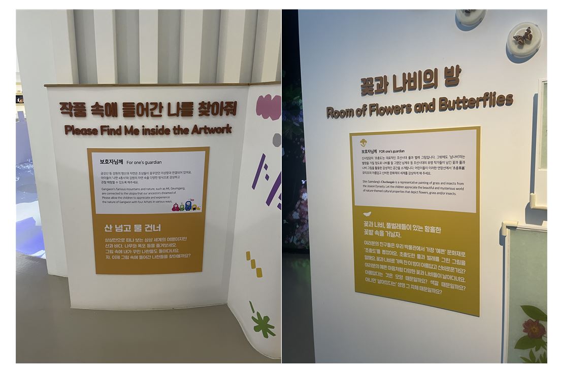 이런 맥락에서 또 하나의 재밌는 지점을 어린이박물관에서 찾아볼 수 있었다얼핏 보기에는 일반적인 전시 패널이지만자세히 들여다보면 보호자님께라는 지칭 대상이 있는 것을 볼 수 있다어린이박물관에서는 어린이와 동반한 보호자에게 어린이가 전시를 감상하는 데 있어 생각해 볼 수 있는 방향을 부탁 내지는 권장하고 있다이처럼 감상의 방향을 제한하는 패널은 일반 전시실에서 찾아보기 힘들기에해당 패널을 처음 발견했을 때는 어린이의 전시 감상만을 돕기 위한 장치라는 생각이 들었다하지만 여러 개의 패널을 반복해서 발견하고 보호자에게도 생각을 요구하는 질문들로 확장되는 내용을 보며오히려 어린이박물관의 이런 장치가 일반 전시실에도 유효하게 적용될 수 있는 것이 아닐까라는 의문점을 가지게 되었다.