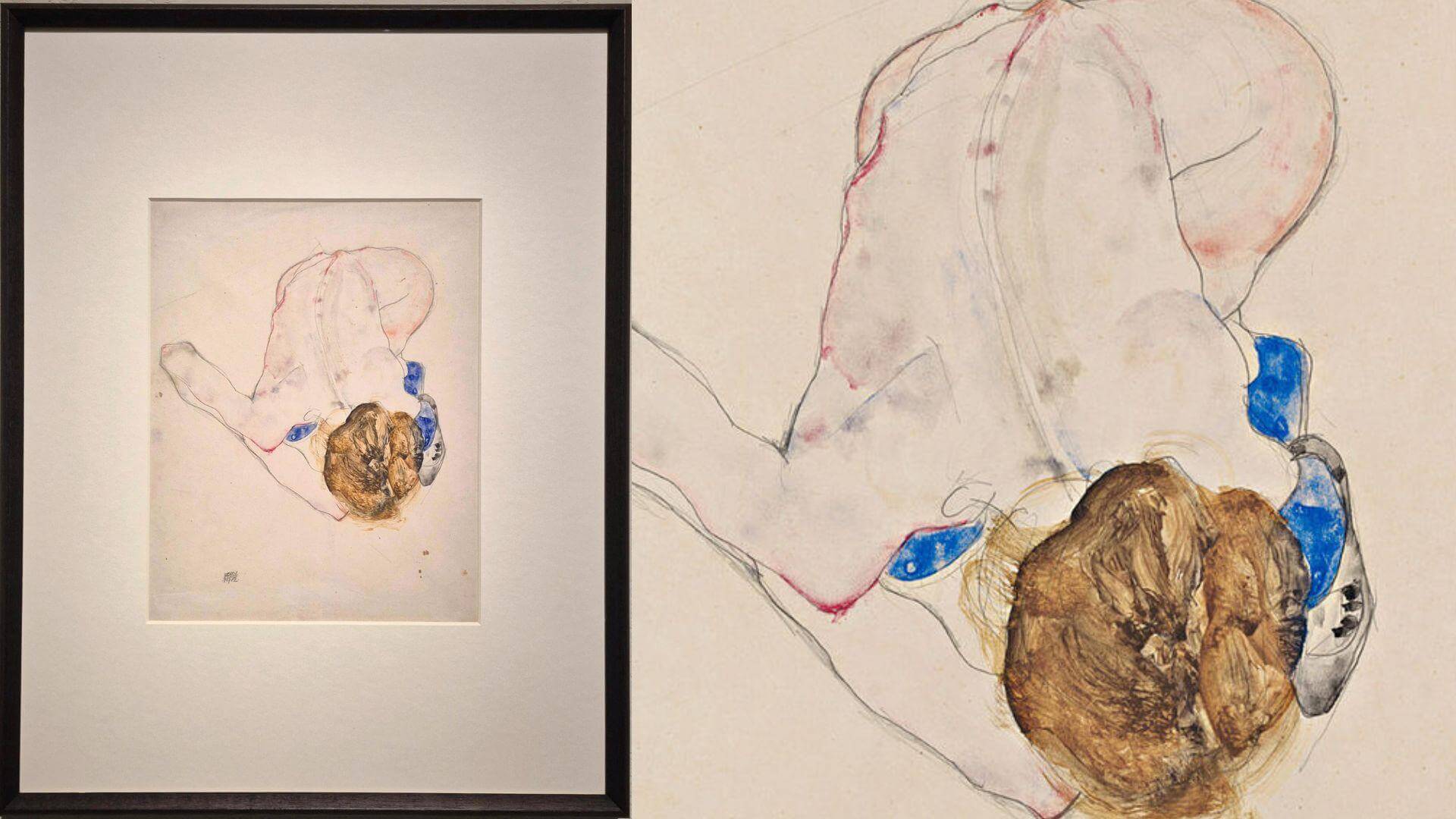 ‘파란 스타킹을 신고 앞으로 몸을 숙인 누드’ (1912), 종이에 연필과 과슈, 레오폴트미술관 소장