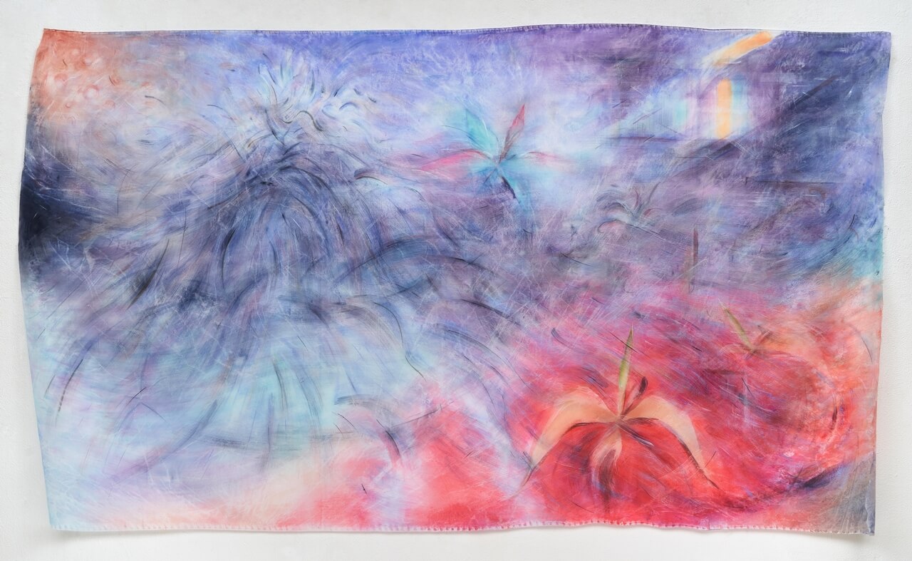 <초여름의 움직이는 창 너머>, 2024, acrylic on translucent fabric, 225 x 150 cm