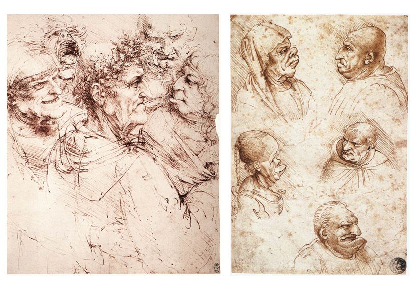 다 빈치의 캐리커처식 드로잉에서 인물들은 매우 커다란 코를 하고 있거나 비정상적으로 두툼한 입술이거나 괴물과도 같이 튀어나온 이마 등의 과장된 모습을 하고 있다(사진 3). 이들의 모습은 현실에서 보기가 드문 변형된 모습으로 각 개인이 가진 성격적 특성을 반영하여 풍자적으로 표현했다고 할 수 있는데, 다 빈치는 해부학 연구를 통해 얼굴의 근육 구조를 이해하고 있었기에 인물 형상의 과장이 더욱 설득력 있게 다가온다. 이러한 다 빈치의 캐리커처식 드로잉은 16세기 후반 안니발레 카라치(Annibale Carracci, 1560–1609)가 본격적으로 캐리커처 장르를 발전시키는데 많은 영향을 주었다(사진 4).