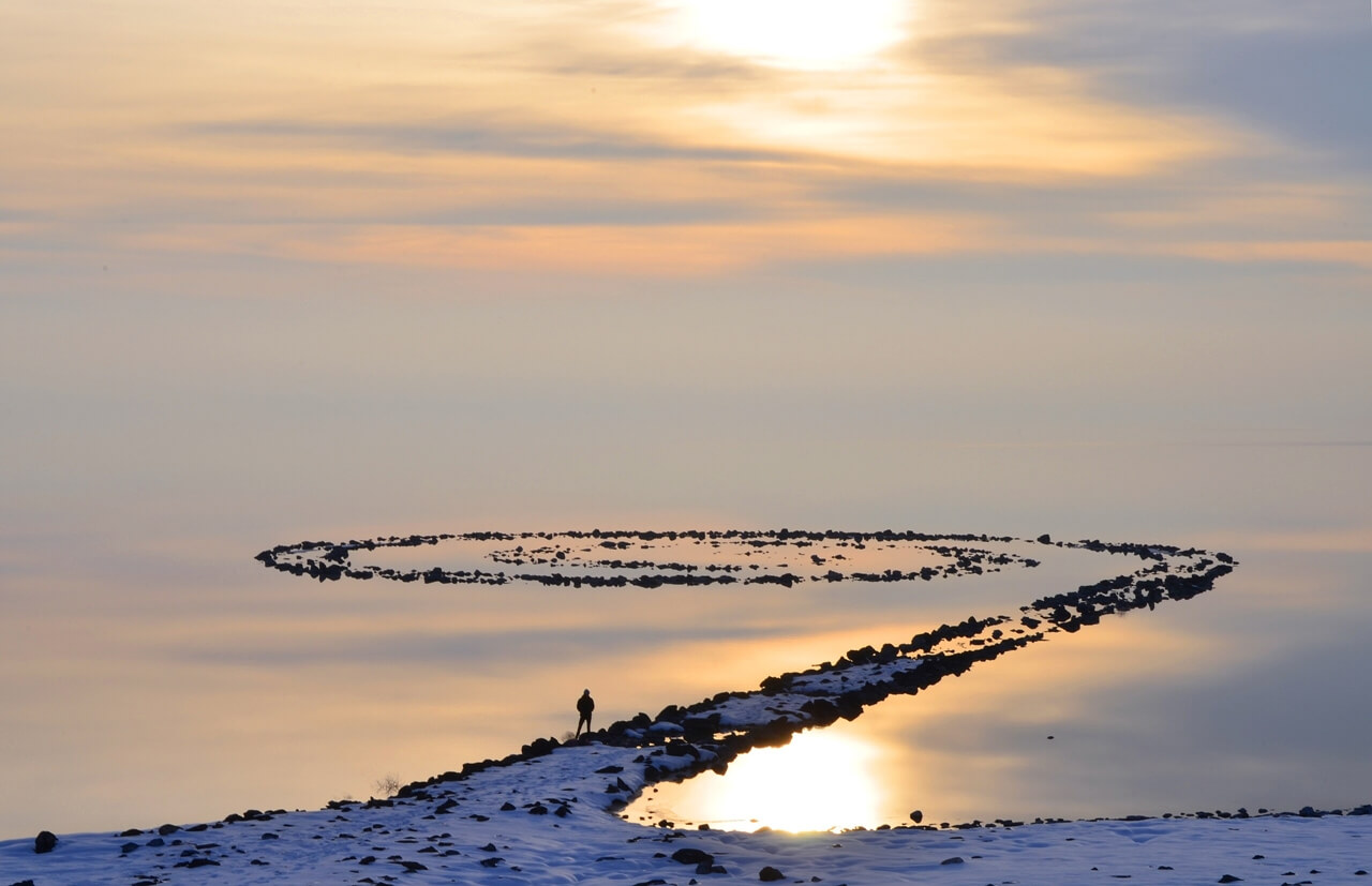 앞서 언급했던 작품, 스미스슨의 《Spiral Jetty》(나선형 방파제)다. 이 거대한 소용돌이 구조물은 길이 460m에 달한다. 바위와 흙으로 만든 둑이 반시계 방향으로 호수 속으로 뻗어 있다.
