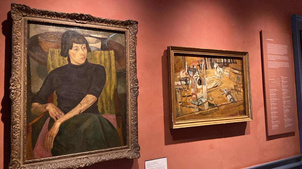 Left: Roger Eliot Fry (1866-1934), Portrait of Nina Hamnett, 1917 Right: Duncan Grant (1885-1978), Still Life - The Dinner Table, c.1912 The Courtauld, London | Photo © Ayla J Lim, 2024