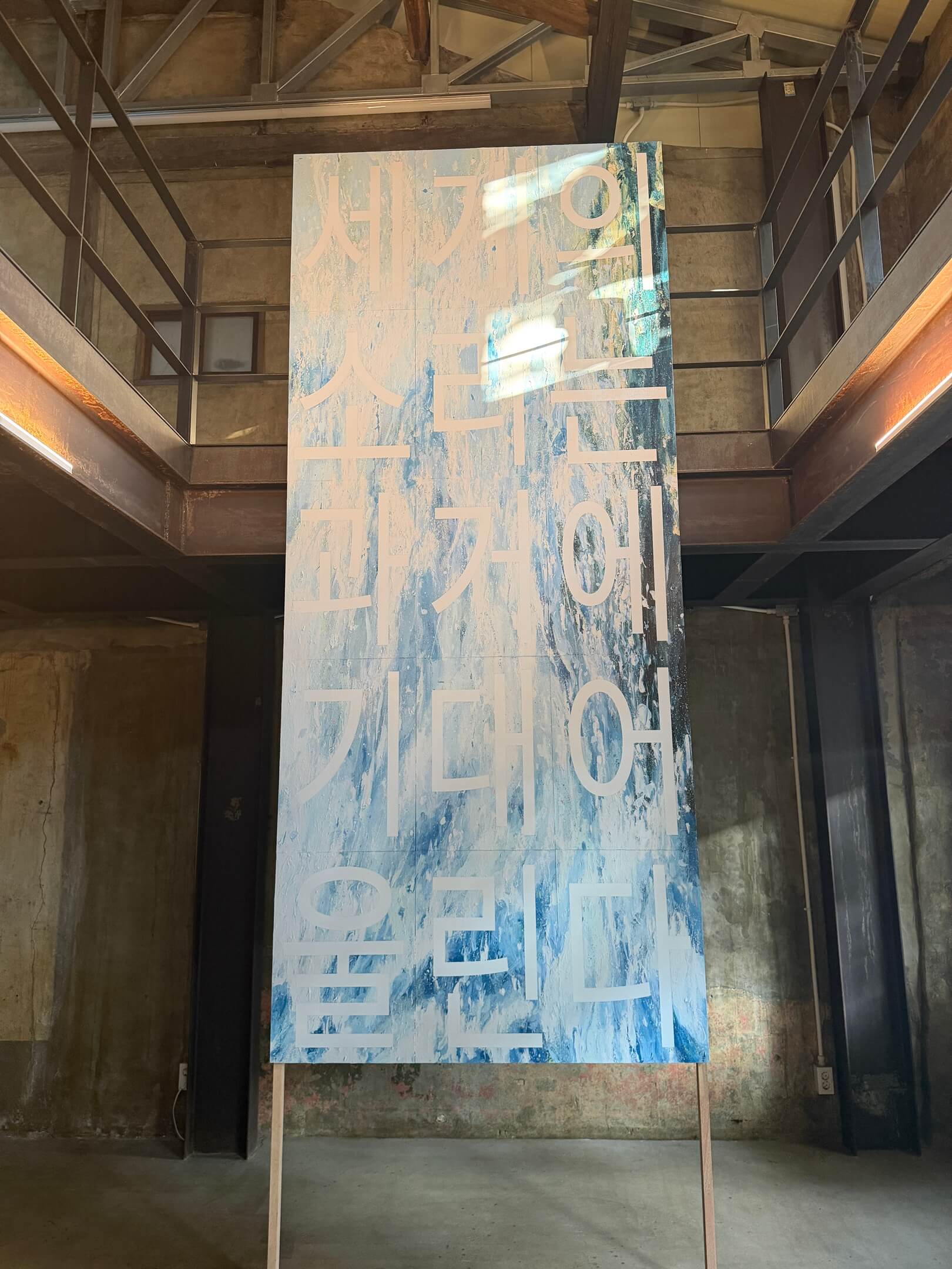 입구로 들어서면 가장 먼저 보이는 김지영 작가의 작품 〈세계의 소리는 과거에 기대어 울린다〉는 성난 파도를 의미하는 ‘노도(怒濤)’ 연작으로, 과거를 의식하여 현재를 성립하는 존재 방식을 드러낸다. 부서지는 파도와 포말의 이미지, 그리고 음절 단위로 분절된 화면들로 구성되어 있으며, 멀어질수록 문장이 읽히는 작품을 통해 김지영 작가는 개인의 삶(미시적이고 분절된 포말, 음절)과 세계(거시적인 화면, 문장)를 바라보는 자신만의 시선을 담아내고자 하였다. 오일 파스텔로 만들어낸 포말의 질감, 그리고 다소 딱딱한 글자체의 간결함은 부서지고 끝내 견고해지는 삶의 축적을 연상케 한다.