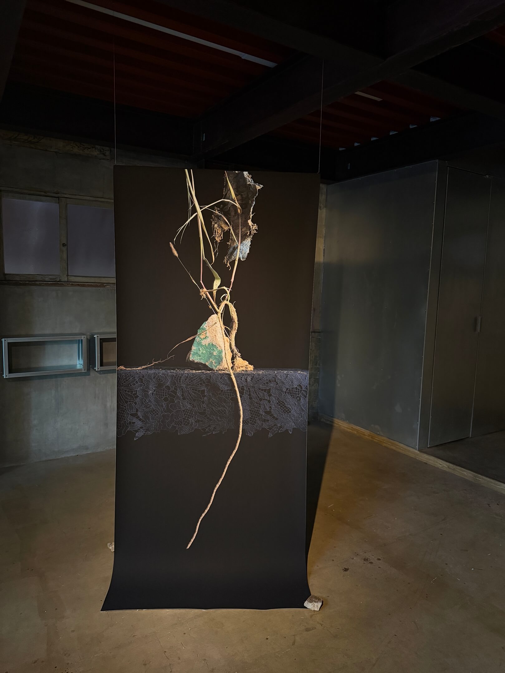 조성연 작가는 송도 국제도시 미개발구역에서 수집한 식물의 이미지를 통해 불온하게 만들어진 생태의 흐름 속 아름다움을 〈still alive〉를 통해 제시한다. 폐기물과 염생 식물, 조경 식물 등 비인간의 시간을 시각화하는 조성연 작가의 작품은 현상을 있는 그대로 보여주는 방식 대신 장식적인 요소를 더한 새로운 이미지를 통해 실제 현상에 대한 상상, 혹은 더 긴 고찰을 하게끔 한다. 검은색 레이스 테이블보가 깔린 검은 좌대 위 메마른 식물들의 이미지에서 인간의 이기심이 초래한 자연의 파열과 그럼에도 자생하고자 하는 식물들의 애쓰는 힘이 느껴진다.