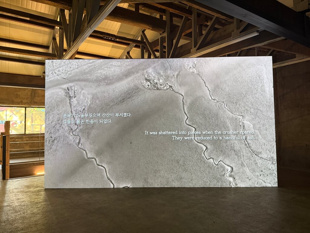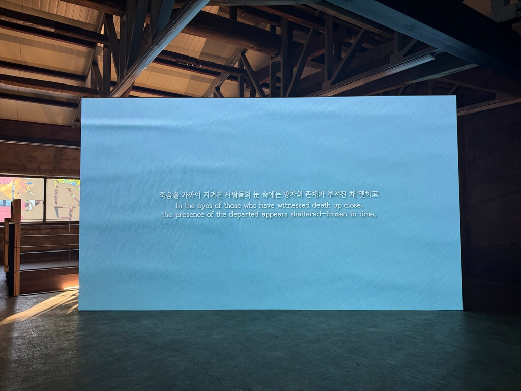 안유리 작가의 〈포효하는 잿더미들〉은 항공 촬영을 통해 얻은 끝없는 바다의 이미지와 이에 이어지는 내레이션을 바탕으로, 바다를 건너 이동한 시신을 중심으로 한 디아스포라 서사를 풀어나간다. 작품은 제주 4·3과 사할린 잔류의 역사적 기록, 그리고 한반도라는 지정학적 위치를 작가 개인의 가족사와 연결하며, 중국어·일본어 등 여러 언어의 내레이션으로 구성된다. 이를 통해 집으로 돌아오지 못한 채 이국에서 잿더미가 된 망자들과, 그들의 죽음에 얽힌 전쟁과 이념의 역사가 여전히 현재로 이어지고 있음을 상기시킨다.
