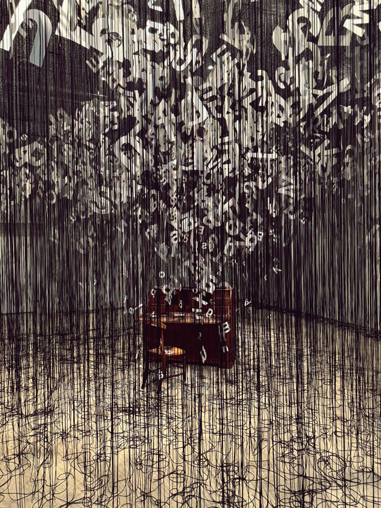 실을 이어 우리 사이의 관계와 감정을 짜는 시오타 치하루 작가는 책상과 활자를 공중으로 이어 올리는 설치 작품을 보여주고 있습니다. 조합되어 의미가 있는 한글이 아니라 분리되어 독립적인 알파벳을 이용해 작업했습니다. 높은 곳으로부터 활자와 책상이 마치 악기의 현絃처럼 맞닿아 있습니다. 실 사이를 조심스럽게 걸어 보세요. 나만의 음색이 공중에 떠다닐 것만 같습니다. 세상의 모든 이야기를 길어 올리고 싶은 작가와, 모든 지식과 지혜를 쟁여두고픈 현자에게 이처럼 활자와 바로 닿는 순간은 얼마나 짜릿할까요? 지금, 이 순간 활자는 날아가고 있을까요, 아니면 매달려 당겨지고 있을까요?