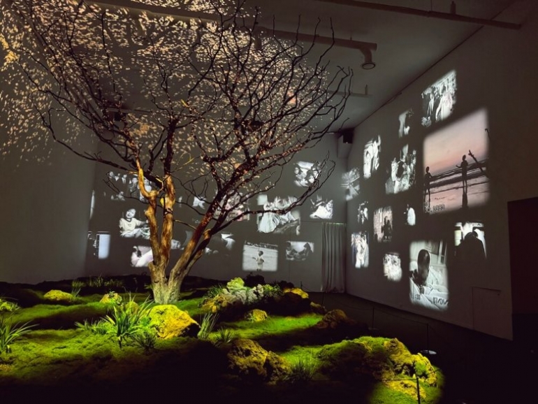 여기는 전시의 마지막 공간입니다. 인간의 삶보다 긴 삶을 살았던 배롱나무 위로 자연의 기억들이 스쳐 갑니다. 시간의 궤적을 그린 계절들과 나날의 날씨, 기후의 변화. 그리고 마지막까지 잃고 싶지 않은 인간의 기억들이 펼쳐집니다. 저는 바로 이 순간에 가슴이 느꺼워져 눈두덩이가 뜨끈해졌습니다. 서로 다른 사람들의 기억 속에서 결코 잃고 싶지 않은 기억은 기이하게도 닮아 있었습니다. 자식이 태어나 처음 마주한 순간, 첫걸음을 떼던 순간, 첫 소리를 내고 웃던 모든 순간. 나무 주위로 세상 어린아이들의 얼굴이 빽빽하게 떠오릅니다.