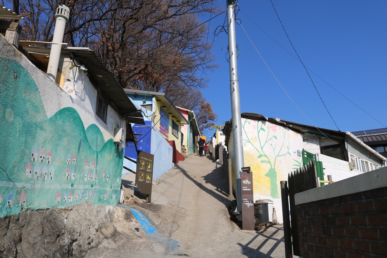 달동네 언덕, 벽화마을의 입구라 할 수 있다. 생각보다 경사가 꽤 큰 것은 느낌은 이제 내가 40 중반에 들어 선 탓 만은 아닐 거다. 달을 맞이하는 동네이니만큼 신발은 편한 것으로 신고 걸으면 참 좋은 길이다. 사진에서 보이는 가운데 난 길이 주 관람로라 할 수 있는데, 주 관람로 조차 매우 좁다. 이런 벽화마을을 걸을 때는 '매너'가 우선적으로 요구된다. 소란스럽게 부산 떠는 내 바로 앞에 사람이 살고 있으니.