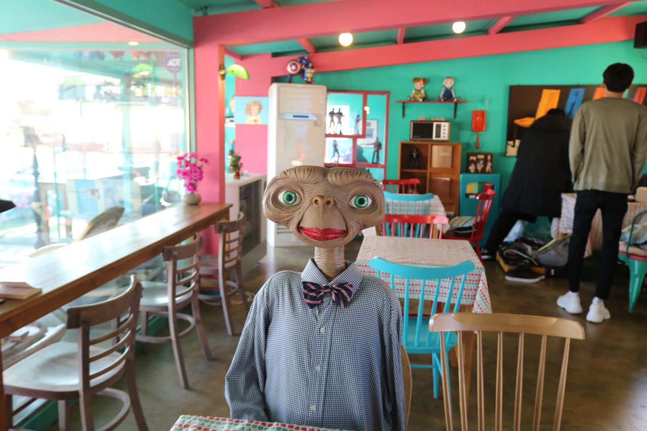 꼬지따뽕의 실내. 외계인 친구가 반기고 있다. 밤에 보면 좀 무서울 것 같다. 입술이 빨갛다. 여기에 카운터와 음료가 준비되는 공간이 있는데, 사실 이 카페에서는 음료를 여기서 마시지 않는다. 아래로 내려가면 정말 더 훌륭한 힐링 스팟이 준비되어 있다.
