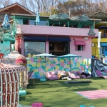 꼬지따뽕은 굳이 따지자면 세 개의 층으로 구성되어 있다. 다음 사진을 찍은 장소가 1층이다. 그리고 사진에서 보이는 핑크색 건물이 2층일 터인데, 따뜻한 방이 준비되어 있다. 작은 규모의 세미나가 가능할 것이다. 외계인 친구가 반겨주던 공간이 바로 사진에서 녹색 파라솔이 펴져있는 곳이다. 3층으로 볼 수도 있을 것 같다.