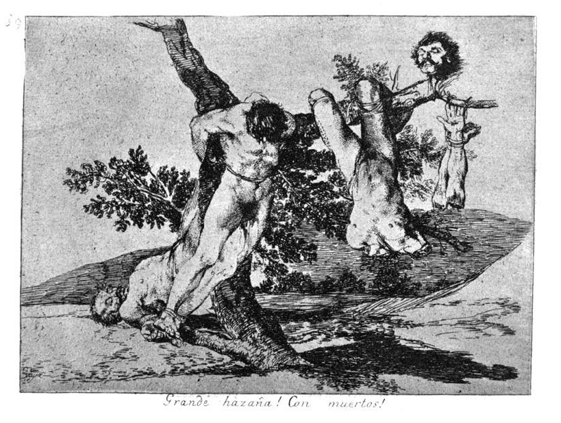 목과 팔 다리가 잘린 채 발가벗겨져 나무에 묶인 사람조차 적나라하게 보여준다. <전쟁의 참화> 39번에서 몸을 잃은 남자는 우리에게 자신의 이야기를 전하고 싶은 열망의 눈빛을 보내고 있다.