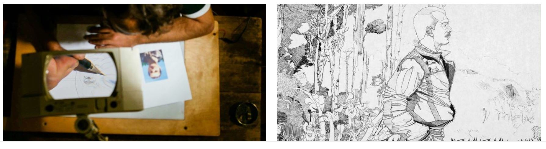 3. 감독은 담벼락에 오랫동안 덧씌워진 벽보들을 뜯어냅니다. 풀칠과 눈과 비, 세월에 의해 몇 겹인지도 모를 지층들이 생겼고, 감독은 끈질기게 시간의 지층을 뚫어냅니다. 별안간 그 틈새로 희미하게 사람들의 얼굴이 보이기 시작합니다. 오래전 붙여졌던 희생자들의 사진입니다. 감독은 그들의 존재를 드러내기 위해 윤곽선을 덧대고 이름과 실종 시간과 장소를 기재합니다. 하지만 감독의 노력에도 불구하고 묻혀진 그들의 복원은 완벽할 수 없습니다.