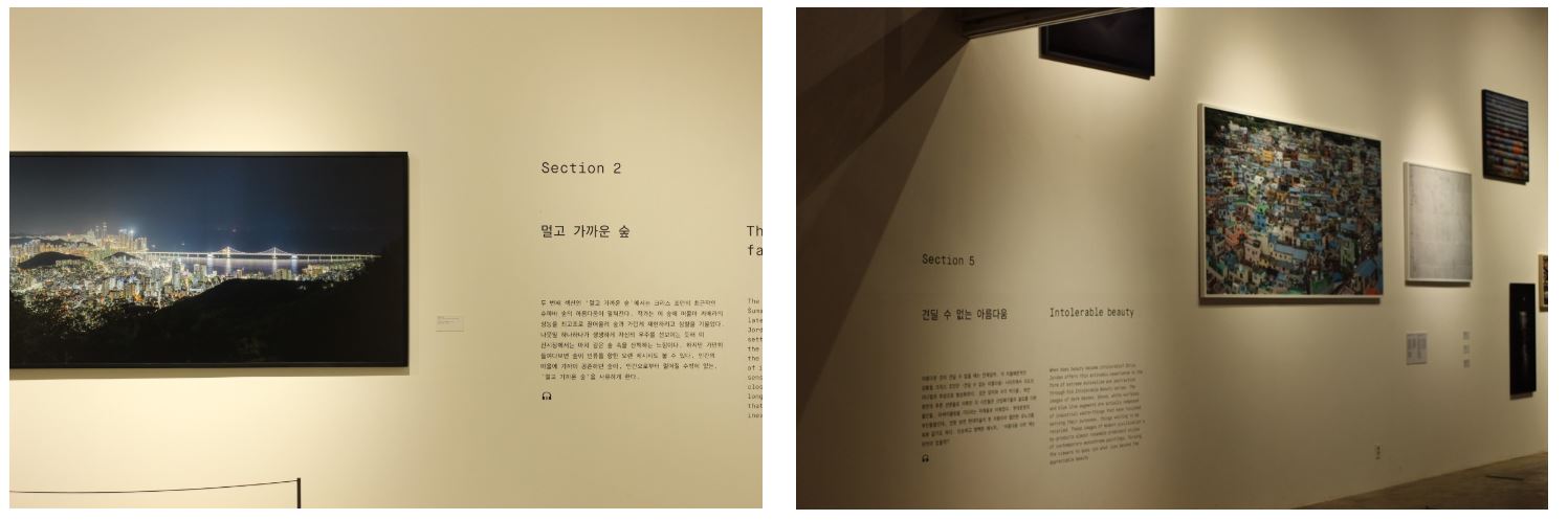 나의 원픽은 '견딜 수 없는 아름다운' 다섯 번째 섹션이었다. 하얀색 드럼통, 줄 세운 산업폐기물, 부산의 감천마을 전경 등. 아름답지만 이율배반적으로 견딜 수 없는 것들의 대립적인 조화로움.