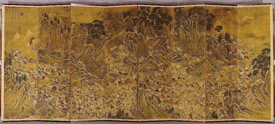 절파법으로 그려진 산천으로 전쟁의 긴박감을 나타냈으며 소나무는 산수화처럼 기의적이며 기표적인 표현이 아니라 점진적으로 내부가 밝아지는 기법으로 시각적 사실감을 주었고 병사들은 강물처럼 웅대하게 흐르듯 그려졌다.