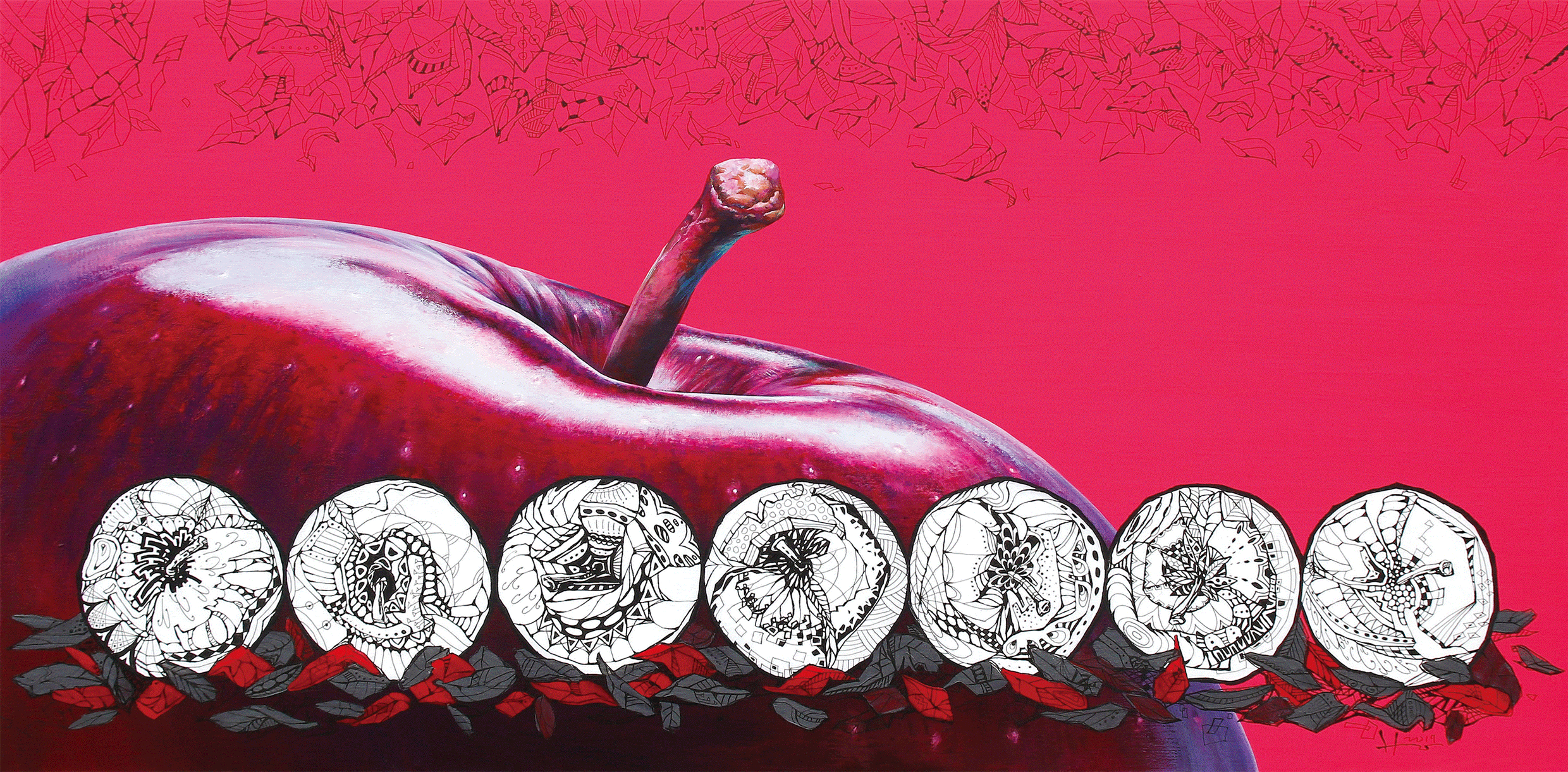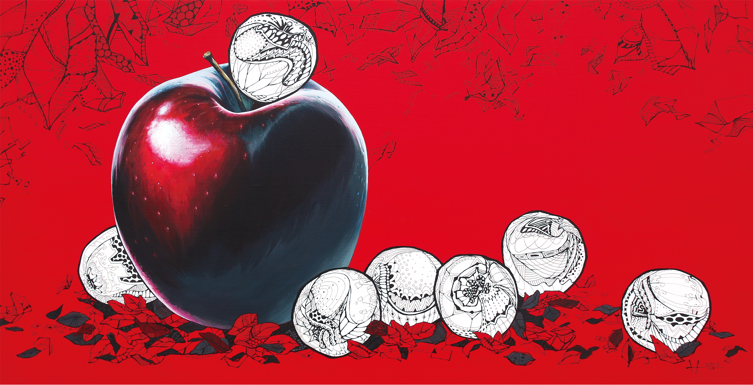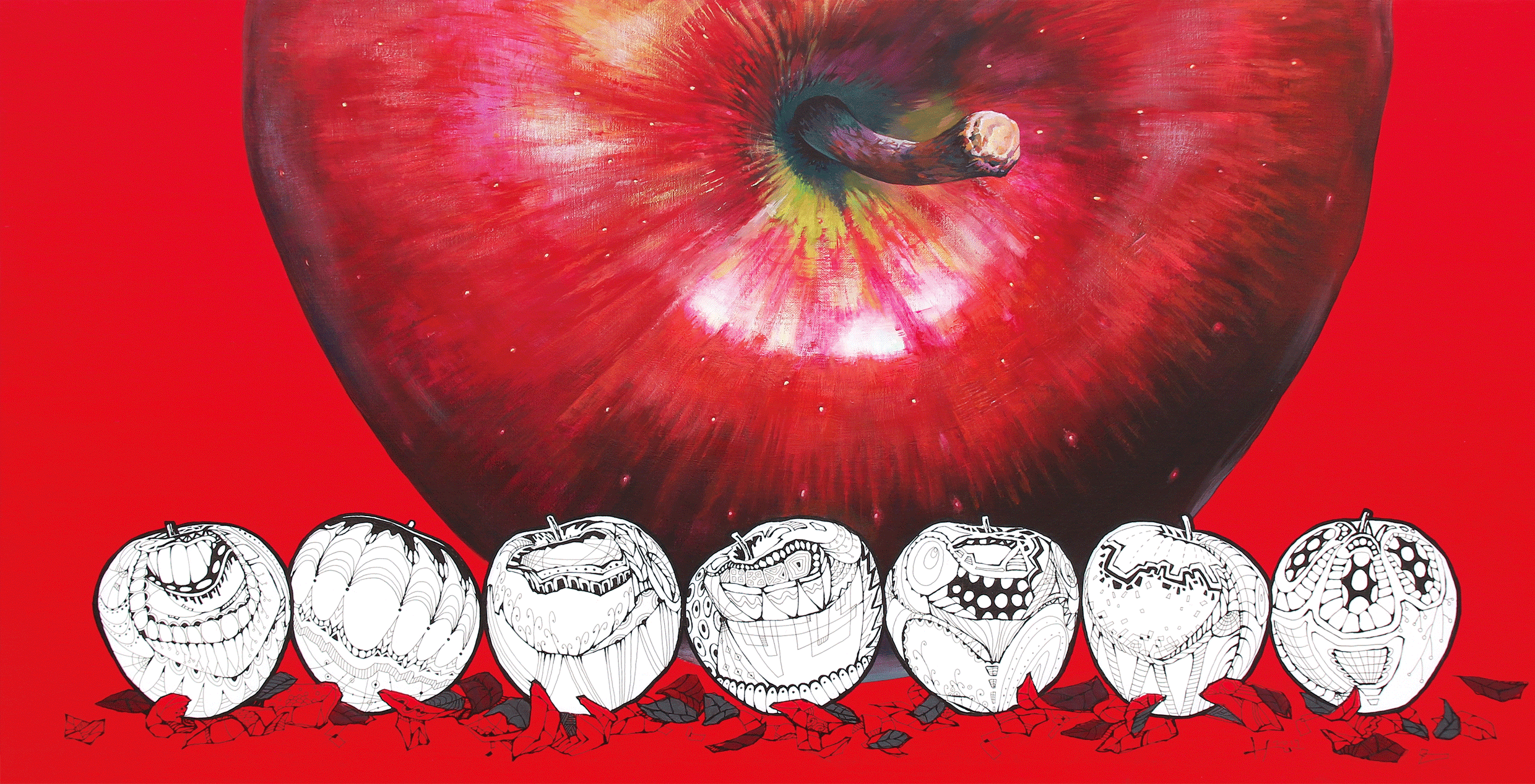 시지각은 감각과 사유가 혼합된 것으로 자신의 몸짓에서 탄생한다. 그러므로 나의 그림에 있어 감각과 판단, 시지각 속에 일어나고 있는 대상의 이미지는 행위속에서 진정한 실체가 비로소 존재하는 것이며, 내면의 사실적 이미지를 구축하고 평면과 입체를 토대로 인간의 형용모순적 이야기를 담아내려 하였다. 그림에서 보면 생명의 시작이자 끝을 암시하는 매혹적이지만 치명적인 붉음의 미를 바탕으로 하얀사과는 일곱쟁쟁이를 상징하는 것으로 내면에 잠재된 각자의 다양한 능력을 나타내려고 하였어며, 시각적 자극을 추구하는 현대 사회에서 자신의 존엄성을 찾고 내면을 들여다 볼 수 있는 기회를 작품을 통해 가질 수 있길 바란다.