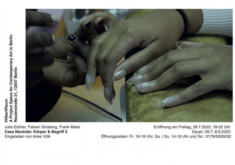 In the video "Nail Bars" (2023) Julia Eichler develops a conversation with visitors and technicians of nail salons in London and Madrid. They talk about fashion and zeitgeist, the creation of their own role and self-image. The camera shows the work of hands and intimacy without filming faces. The nails usually last two weeks.