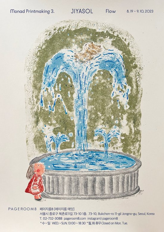 지야솔 작가의 《Flow》에서 ‘물’의 흐름과 관련된 계절감, 감정, 유희 등을 표현한 석판화 20여 점을 선보인다. 이번 전시의 주요 소재인 ‘물’은 작가가 2022년에 크로키 북에 우연히 그리게 된 ‘물을 맞고 있는 개구리’ 드로잉에서 시작되었다. 중력으로 인해 흐르는 물줄기를 만지며 노는 아이들과 동물들, 감정이 드러나는 눈물, 내면의 고요함을 일깨우는 바다, 뙤약볕에 흘리는 땀과 심지어 인공적인 열로 인해 기화된 수증기, 수증기인 구름에서 내리는 비 등 다양한 모습으로 이어진다. 이렇게 인체의 안팎에서 없어서는 안 될 중요한 요소인 ‘물’의 변주는 지야솔 작가의 작품에서 판화의 판에 대한 물리적인 제약을 넘나들고 그림들을 매개해 주는 역할을 한다.