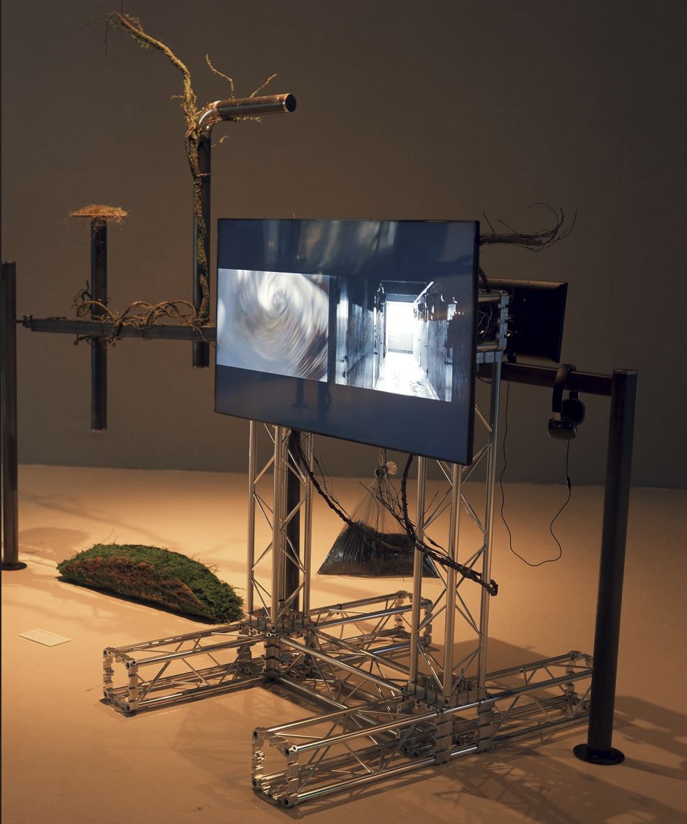 <원시적 열망의 환기 : 소생하는 기억의 틈 사이에, 리얼타임 비디오 인스톨레이션, 가변크기, 철 프레임에 혼합재료>