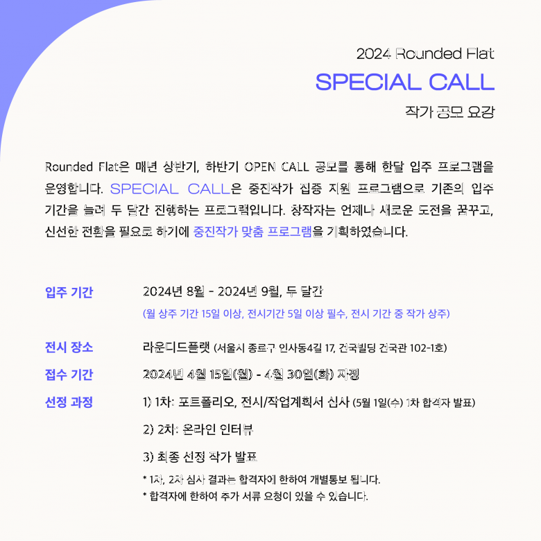 선정 작가는 2024년 8월-9월에 걸쳐 두 달간 ‘라운디드 플랫’을 사용하게 됩니다. 그리고 최종 협의를 통해 입주 기간 동안 작업 기간과 전시 기간을 설정하게 됩니다. 장르, 형식을 망라하고 종로구 인사동에 위치한 전시 공간을 멋진 작업과 개성 있는 발상으로 채워주실 작가님을 모집합니다. 많은 관심과 지원 바랍니다.