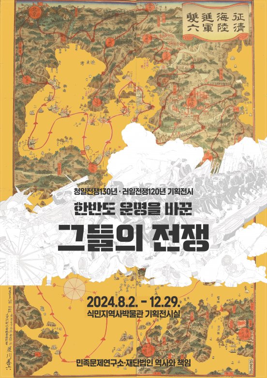 청일전쟁 130년 · 러일전쟁 120년 기획전시 〈한반도 운명을 바꾼 그들의 전쟁〉은 조선인들의 시각으로 바라본 두 제국주의 전쟁에 대한 재해석을 담고 있습니다. 한반도를 둘러싼 두 개의 전쟁을 올바르게 이해하기 위해서 ‘타자가 아닌 우리의 인식’ 속에서 ‘부분이 아닌 전체’를 조망하고 있습니다.전시는 1부 조선 정탐과 침략지도, 2부 그들의 전쟁, 일그러진 성공신화, 3부 불편한 기념, 왜곡된 기억으로 구성하였으며, 민족문제연구소가 30여 년간 기증받고 수집해온 청일전쟁 · 러일전쟁 관련 희귀자료 26건 58점이 공개됩니다. 주목할 만한 자료로는 청일전쟁 두루마리 2권을 포함한 니시키에(다색판화) 38점을 비롯하여 각종 풍속화보·침략지도·군용회화책·기록사진집 등이 있습니다. 당시 열강과 동아시아의 국제정세를 날카롭게 비판한 풍자화 32점도 전시됩니다.