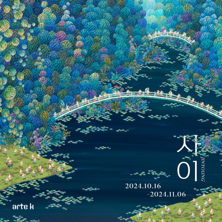 ‘사이’라고 말하며 우리는 두 개의 지점 사이에서 벌어진 거리, 혹은 그 가운데 비어 있는 공간을 떠올린다. 그러나 진영 작가는 모든 ‘사이’에서 생동하며 흐르는 것이 있음을 포착하고 캔버스 위로 옮겨온다. 그것은 과거와 미래 사이에 놓인 오늘처럼 정의되지 않은 다양한 형태로 존재한다. 창과 창 사이로 부는 바람처럼 사소하고, 너와 나 사이에 흐르는 대화와 온기처럼 다정한 것이기도 하다. 그렇기에 이번 전시 제목으로 쓰인 명사 ‘사이’는 ‘space’, ‘gap’, 나아가 ‘between’, ‘relationship’으로 읽어낼 수 있는 각각의 의 미에 대응하기보다는, 그 속에서 차오르는 다채로운 삶의 이야기를 아우르는 역할로서 기능한다.