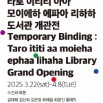 본 전시에서 다루는 책과 도서관은 아비 바르부르크의 므네모시네 아틀라스처럼, 잠시-고정 되어있는 상태이다. 언제든지 다른 사유와 맞닿을 수 있고 책을 읽는 이와 상호작용하는 방식을 추구한다. <감정 도서관>, <그림 도서관>, <허물 도서관>, <씹는 도서관>, <덧조각 도서관>, <경험의 도서관>이 잠시-묶인 “타로 이티티 아아 모이에하 에파아 리하하” 도서관은 “뭐?(What?)”로 번역된다. 뜻밖의 상황에서 당황함을 표현하는 감탄사. 책, 도서관, 아카이빙, 전시의 질서를 횡단하는 이 곳에서 그 감탄사가 끊이지 않기를, 또 다른 도서관과 잠시-연결되기를 희망한다.