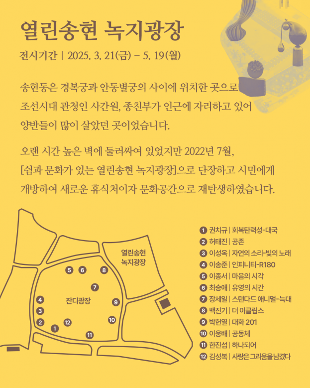 열린송현 녹지광장에는 총 12점의 야외 대형 조각작품이 전시됩니다.