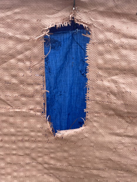 이렇게 제 몸은 기능을 잃고 일상의 지도에서 사라진 채 단편적으로만 남은 건축물의 운명과 공명합니다. 영상과 함께 전시되는 여섯 장의 사진 중 두 장은 제 모습을 담고 있습니다. 한 장에는 풍경 속에 영화의 한 장면처럼 온전히 녹아 누워 있는 제가, 다른 한 장에는 솔잎에 얽힌 머리카락과 더러움이 묻은 얼굴 일부가 클로즈업되어 있습니다. 평소엔 지나치기 쉬운 디테일을 강조해, 그 한 컷이 전체 경험을 응축하는 힘을 드러냅니다. 나머지 네 장은 공사장 주변에서 흔히 볼 수 있는 찢긴 철망을 집중적으로 포착했습니다. 대개 무심히 지나치는 이 작은 파편들이 화면에 담김으로써 사소해 보이는 것에 눈길을 돌렸을 때 비로소 발견되는 새로운 감각을 일깨웁니다.