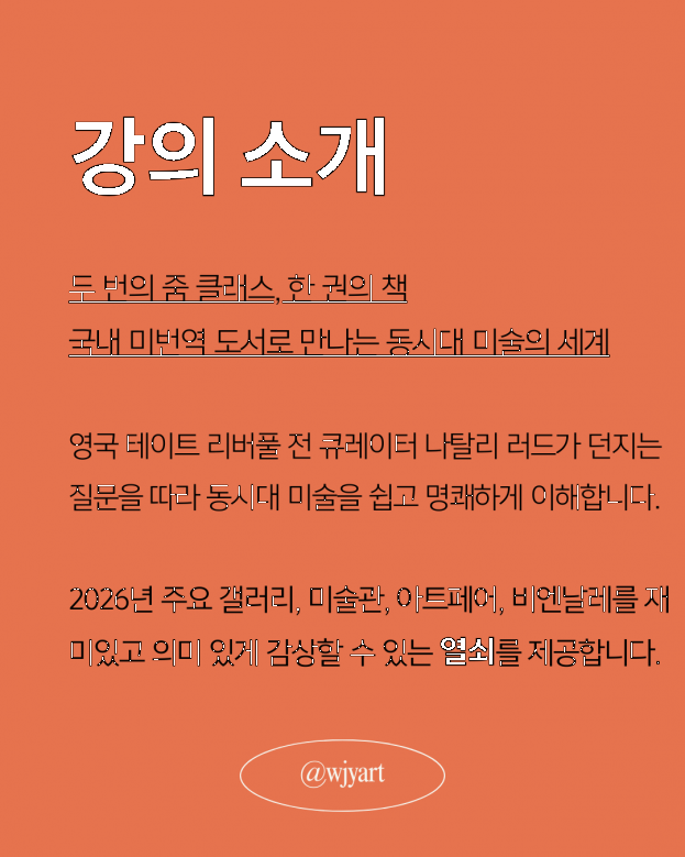 영국 아츠 카운실 컬렉션과 테이트 리버풀의 큐레이터였던 나탈리 러드(Natalie Rudd)의 『CONTEMPORARY ART』를 함께 읽습니다. "미술은 누구나 즐길 수 있어야 한다"는 저자의 철학을 담아 난해한 동시대 미술을 쉽고 명확하게 안내해드립니다.