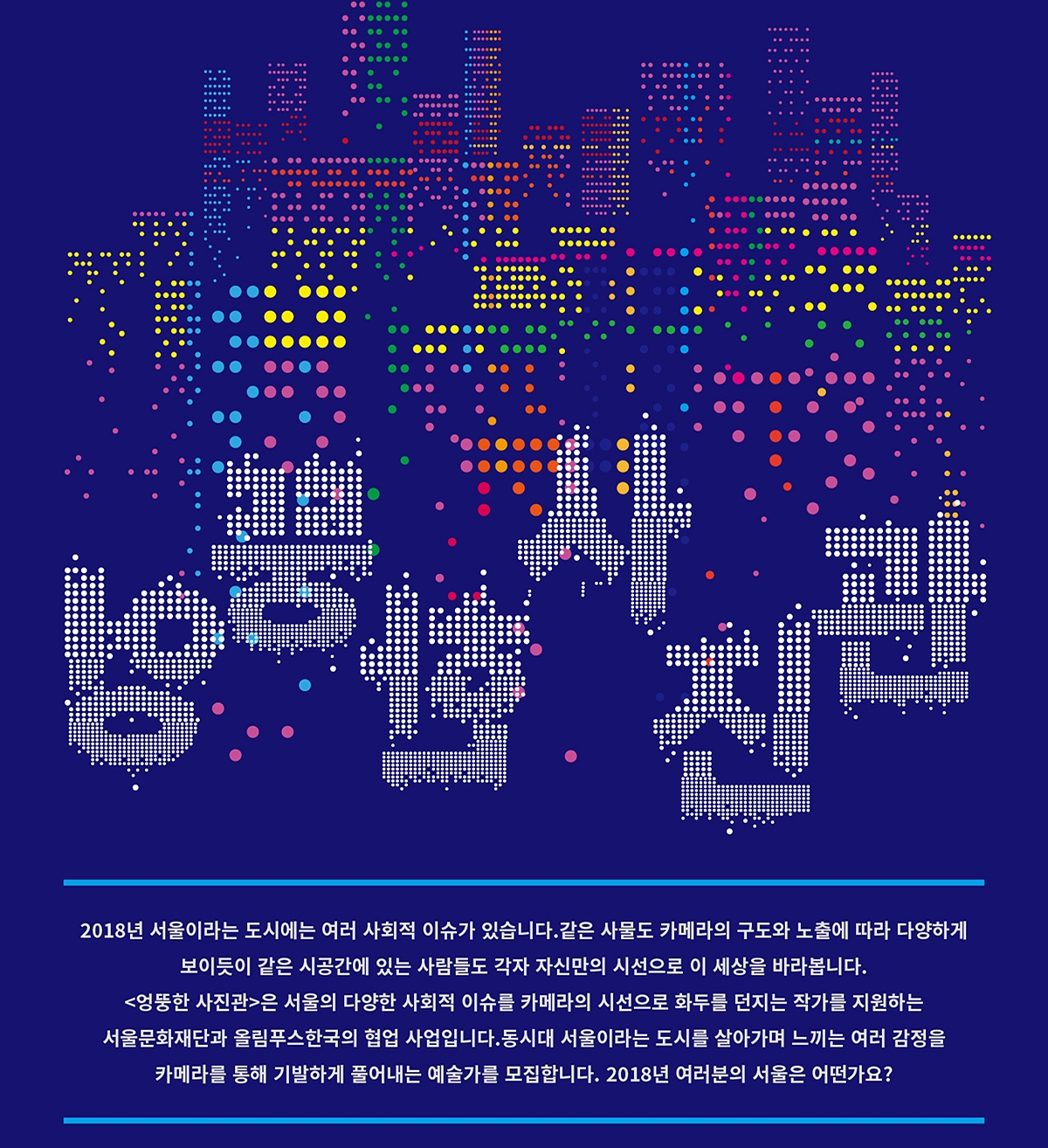 <엉뚱한 사진관>은 서울의 다양한 사회적 이슈를 카메라의 시선으로 엉뚱하고 재미있게 풀어내는 지원사업입니다. 기발하고 참신한 아이디어를 담은 사진 작업을 통해 우리가 살아가는 서울이라는 도시와 동시대의 이슈에 대한 공감대를 형성하고, 이를 통해 예술의 사회적 가치를 확산하는 프로젝트입니다.