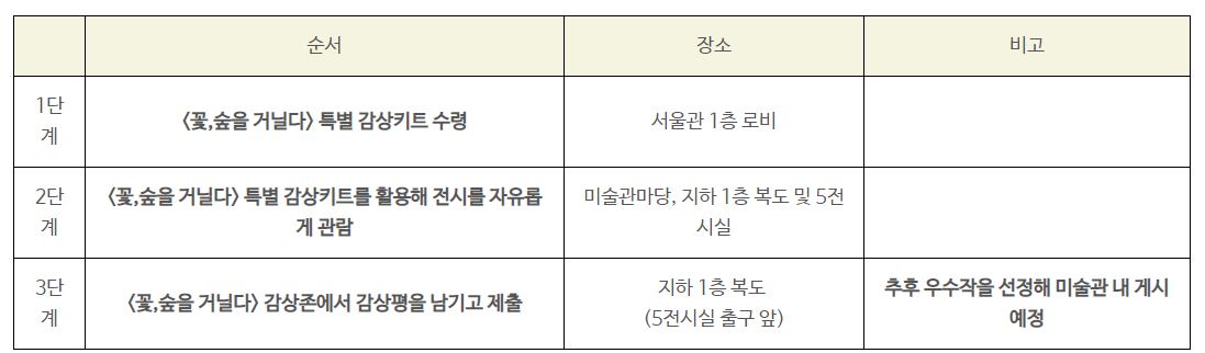 본 프로그램은 국립현대미술관 서울 전시 특화프로그램으로 마치 숲길을 산책하듯 미술관을 거닐며 최정화의 작품을 집중적으로 감상하는 관람객 참여 문화프로그램입니다. 11월 '문화가 있는 날'을 맞아 11월 22일(목)부터 11월 28일(수)까지 MMCA 서울 로비에서 <꽃,숲을 거닐다> 감상키트를 선착순 배포할 예정입니다. 이번 감상 가이드에는 전시에 소개되고 있는 7점의 작품에 대한 상세 정보와 최정화 작가의 글이 수록되어 있으며 관람객이 직접 감상평을 남길 수 있는 활동지가 포함되어 있습니다.