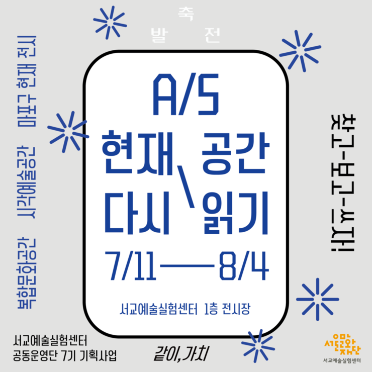 오는 7월 11일부터 8월 4일까지 서교예술실험센터 1층을 홍보관으로 설정하여 마포구에 위치한 시각문화복합공간 30곳의 좌표와 근황을 현재진행형으로 돌아보는 전시입니다. 찾기 보기 쓰기의 과정을통해 공간들만의 개성있는 프로젝트를 확인할 수 있습니다.