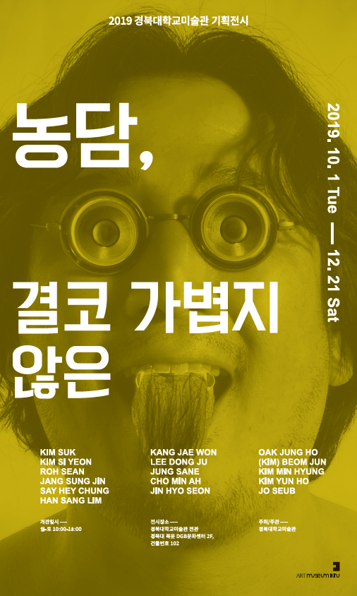 일상 속에 자연스럽게 스미고 있어 그 독특한 지위를 인식하지 못하였던 농담. 이것은 이제 다원주의 예술이 도래한 현 시대에 언어의 경계를 넘어 시각예술에서 표현의 도구로써 새로운 역할을 부여 받는다. 또한 낡은 사고체계에 전복을 가하며 고정된 인식, 습관화된 기대 등을 파괴하는 묵직한 연장으로 우리의 손에 쥐어졌다. 이번 전시를 통해 결코 가볍지 않은 웃음과, 결코 가볍지 않은 농담의 시대발전을 위한 의지와 힘을 발견하고, 유용성을 펼쳐나갈 수 있길 바란다.