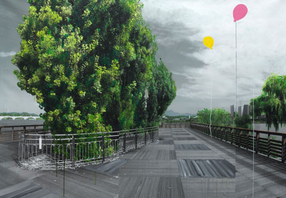 강홍구, 〈녹색연구-서울-공터-선유도〉, 2019. 캔버스 위에 피그먼트 프린트, 아크릴채색, 140 x 200 cm. 이미지 출처: 작가.
