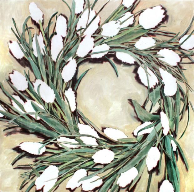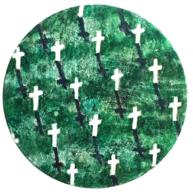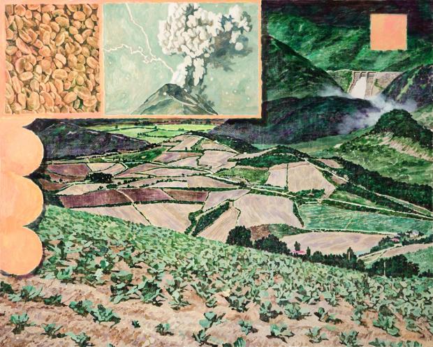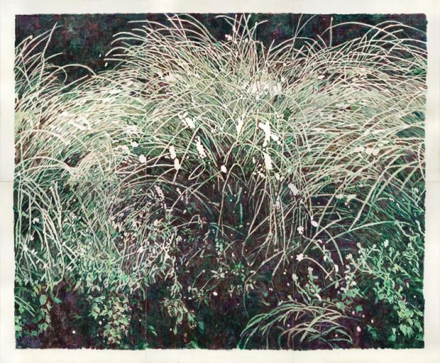식물로 뒤덮인 화면은 대개 녹색 계열의 주조색을 바탕으로, 흰 방울이나 거품, 격자, 시각적 질감을 강렬히 풍기는 다양한 모양새의 구름, 산자락, 바위(혹은 이들을 연상시키는 형태)로 이어진다. 희고 누런 줄기로 거미줄처럼 엮이기도 하고, 화면 속에 또 다른 화면이 나란히 들어차거나 겹치면서 다층적 구조를 획득한다. 어딘가에서 떠오른 크고 작은 흰 방울은 프레임의 경계에 가려지기도 하고, 때론 경계를 넘어 다른 화면으로 자유롭게 넘어간다. 자유로운 화면 분할을 암시하듯 사방으로 구획한 논밭이 들어차고, 그 앞을 사선으로 가르며 누렇게 뻗은 밭두렁은, 땅의 모양새인지 또 다른 화면 구획인지모호한 모습으로 감상자의 상상력을 끝없이 자극한다.