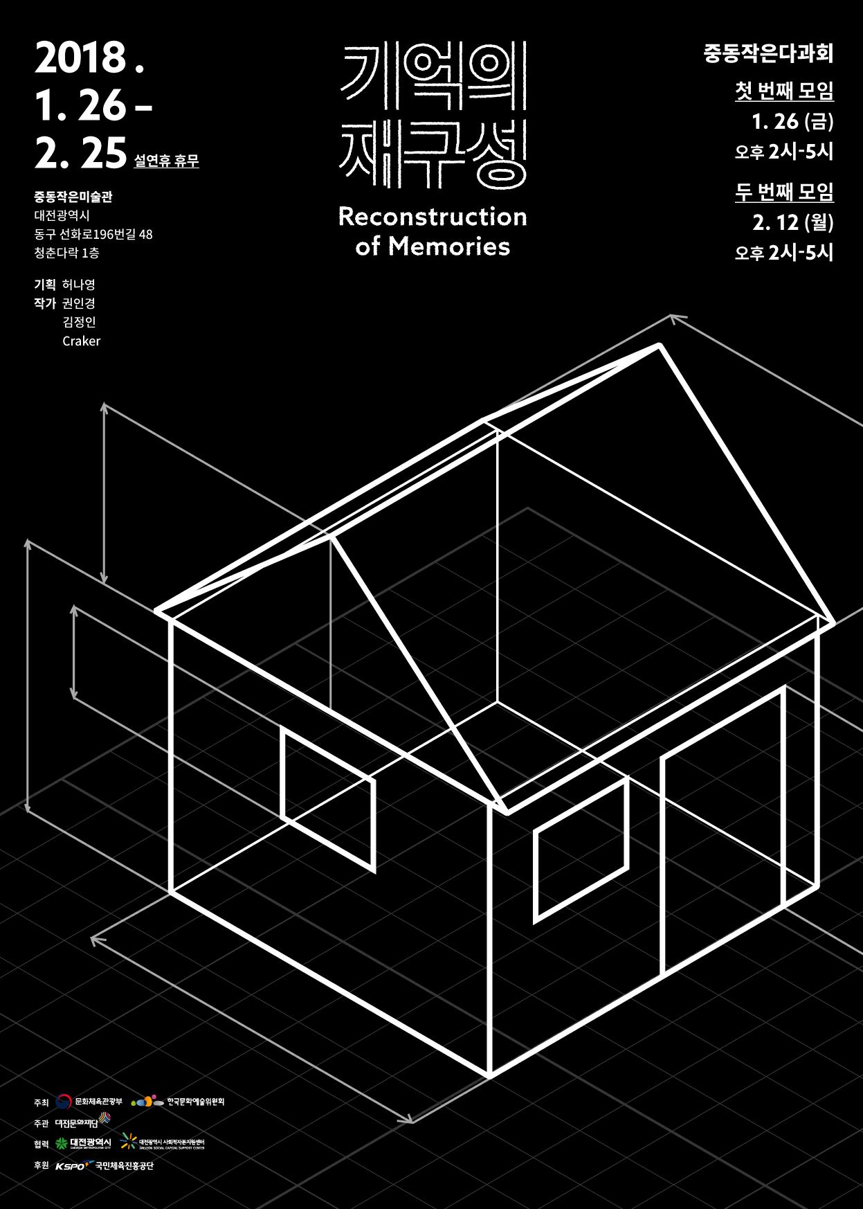2018년을 여는 1월부터 설이 있는 2월까지 열리는 <기억의 재구성>전은 2017 작은미술관조성 운영사업 일환의 기획공모를 통하여 선정되었다. 중동이라는 대전의 독특한 공간을 예술가의 시선으로 담아낸다. 작가의 개인적인 기억과 공간의 파편을 한국화의 방식으로 표현하는 권인경, 인간의 흔적이 묻어있는 작은 골목을 유화로 표현하는 김정인 그리고 관람자에게 중동에 대한 기억을 직접 체험해볼 수 있게 도와줄 미디어아트 그룹 크래커(Craker(김화슬, 김정훈))이다. 이 작가들은 비록 짧은 시간이지만 중동 지역을 둘러보고 주민과 상인 그리고 청년의 이야기를 듣고 자료를 보면서 중동에 대해 자신만의 방식으로 이해를 하고 이를 작품으로 표현한다.