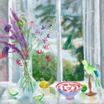 Melanie Parke lives in rural Michigan surrounded by beauty: nature’s beauty and the beauty she herself creates. Parke’s paintings reveal her to be a curator of objects and a collector of memories. Her paintings aptly communicate a belief that objects such as a teacup, a vase of flowers or a small memento not only decorate our home, but are infused with emotion and memories of place, rituals and friendships. In her paintings a pot of tea may be set on a table waiting to be poured or the reminder of an afternoon with friends; its presence implying the passing of time, pleasure, longing or comfort. Birds sometimes populate Parke’s paintings, their lively presence suggesting curiosity and blurring the domestic interiors with the outside world. Often, a pastoral meadow or sliver of blue lake is visible through an open window, inviting the viewer’s eye to wander beyond the still life tableau. The elements in Parke’s layered compositions variously deconstruct and recompose themselves calling to mind the art historical tradition of pattern painters such as Bonnard and Vuillard. Parke, too, subverts the notion of surface and ground, subject and object, and notions of ornamentation and exacting representation. Parke also explores the idea of never-ending transparencies and materialism, looking through walls and hard surfaces to reach the other side of a thing and to keep looking. Beyond formal ideas and the composition, each painting in this exhibition speaks of the palpable pleasure of painting itself. Parke paints in broad gestures, her textured, open brushwork giving way to small moments; brushstrokes and daubs of color seem to alight on the surfaces of patterned vases, picture frames and tablecloths. Painting is evidently a pleasure-seeking process for the artist, and she conveys her delight to the viewer with beauty, skill and generosity.