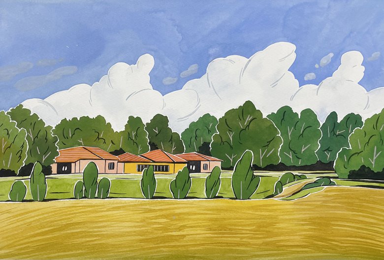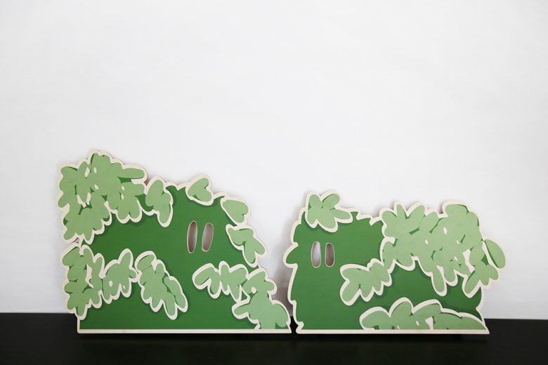 이미정은 작가로서 자신과 사람들 사이에 동시대적으로 형성되는 공통된 감수성을 시각적으로 탐구합니다. 이번 전시에는 수채 드로잉 여섯 점과 풍경 조각 설치 작업을 선보입니다. 바닥에 놓인 풀, <Flat-pack: green plate>의 눈과 눈을 마주쳐보세요. 무엇이 보이시나요? 이 '눈'에는 구멍이 뚫려 있어서 눈을 마주칠 수 없습니다. 대신 우리는 판재의 단면을 보거나, 배경색을 보게 됩니다. 기차 창문으로 보이는 아름다운 풍경 그림, 작품 제목 <Train, Window, Aesthetic, Wallpaper IMG>는 아름다운 배경화면을 찾을 때 사람들이 많이 이용하는 검색어입니다. 가로로 길게 걸린 그림들 사이사이 나무, 건물, 구름, 구덩이에 눈이 있습니다. 작가에게 이러한 눈 이미지, 눈구멍 도상은 여러 작품에서 반복적으로 등장하는 하나의 미적 요소입니다. 이를 통해 관람자는 자신의 눈을 작품 속의 눈과 동일시할 수 있습니다. 예상치 못한 위치에 놓인 눈은 이미지와 나 사이의 상호작용을 만들어 냅니다.
