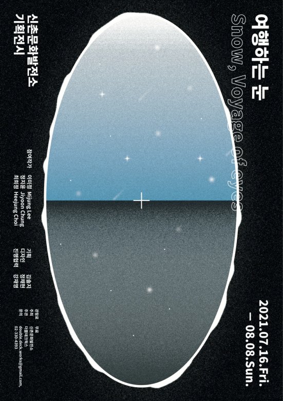 눈앞의 대상을 끊임없이 읽어 들이는 '눈'의 움직임은 인간이 자신이 놓인 세계를 지각하고, 이를 통해 자신의 내면을 스스로 만들어가는 데 필수적인 신체 활동입니다. 누군가는 눈이 아닌 손으로, 귀로, 마음으로 세상과 소통할 수도 있을 것입니다. 《여행하는 눈》은 내가 세계와 관계 맺는 활동을 눈의 움직임으로 표현해보고자 합니다. '보기'는 눈앞의 사물, 사람, 풍경을 보는 것보다 조금 더 멀고 긴 여정일 수도 있습니다. 어쩌면 땅에서 증발한 수증기가 모여 구름이 되고, 겨울 공기와 만나 눈 결정체가 되어 내릴 때까지, 그렇게 여러 번의 첫눈이 내릴 때까지 지속할 수도 있을 것입니다. 최희정, 이미정, 정지윤 세 작가는 세계에 접하는 눈을 통해 '나'를 알아차리고 형성하는 과정을 이미지로 나타냅니다.